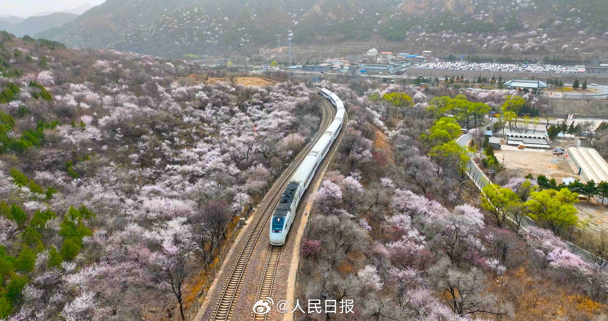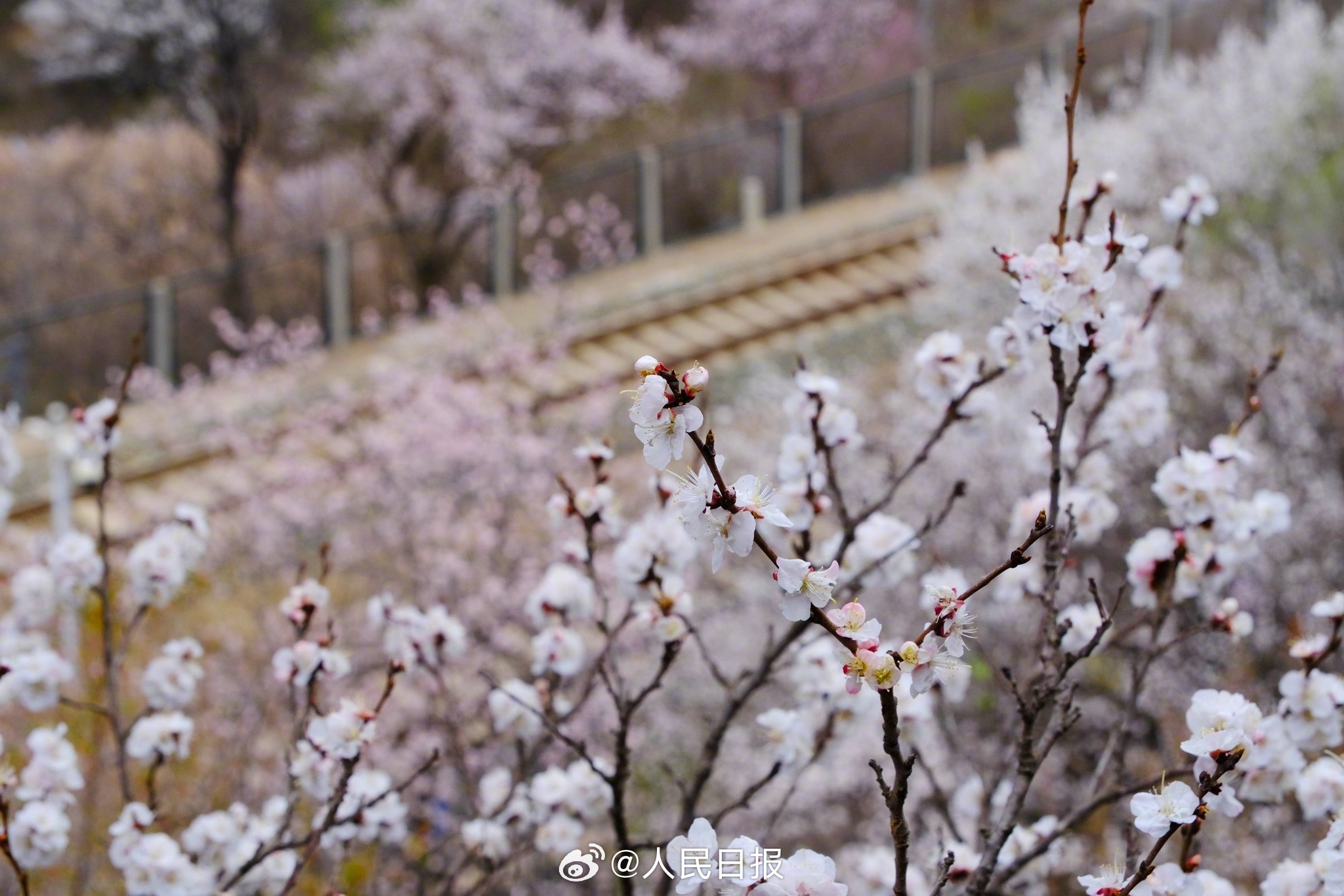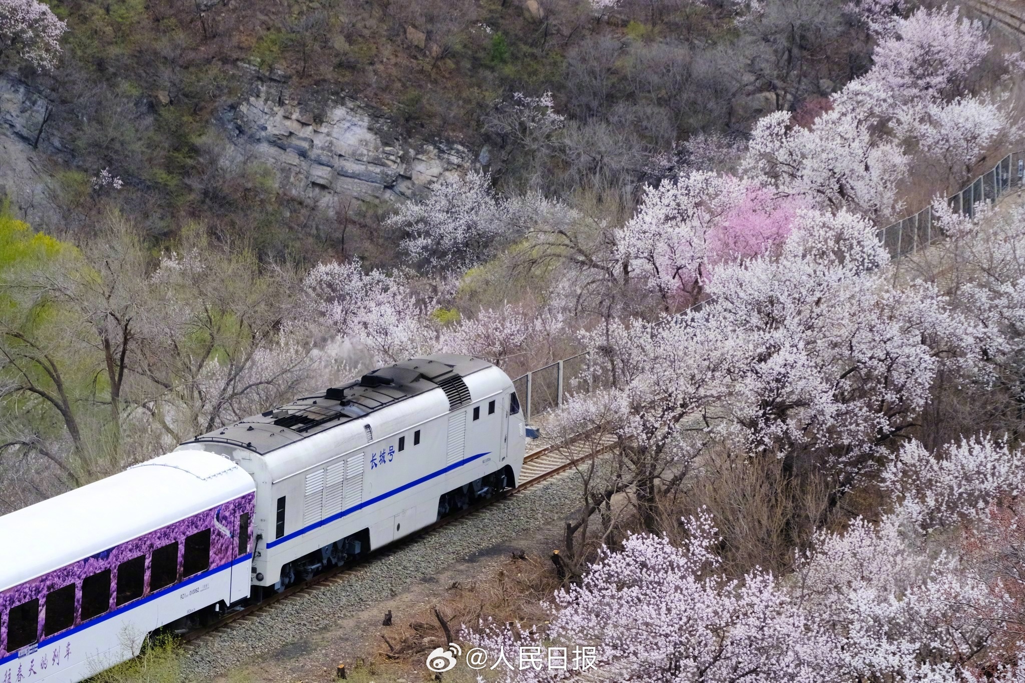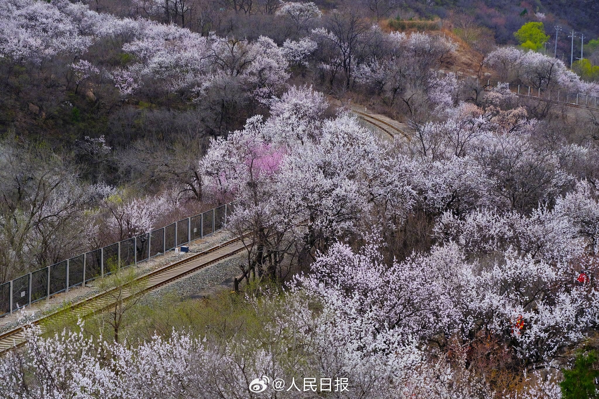 3月28日,北京居庸关花海栈道,近郊铁路S2线穿行花海之中,山桃花和山杏花盛放,成为春日绝佳拍照景点。