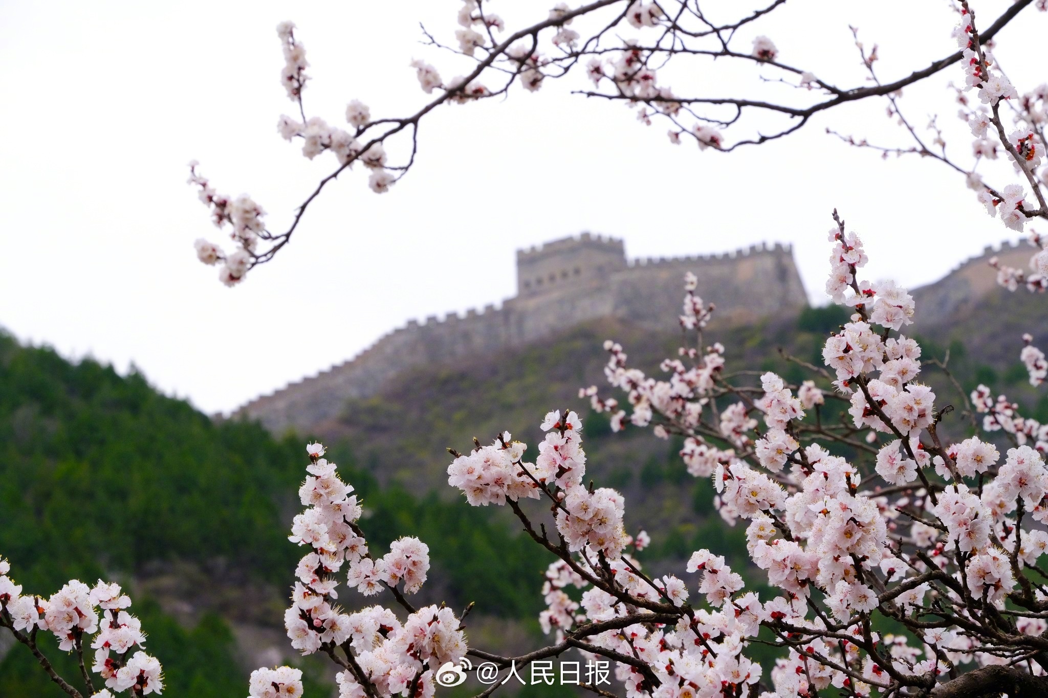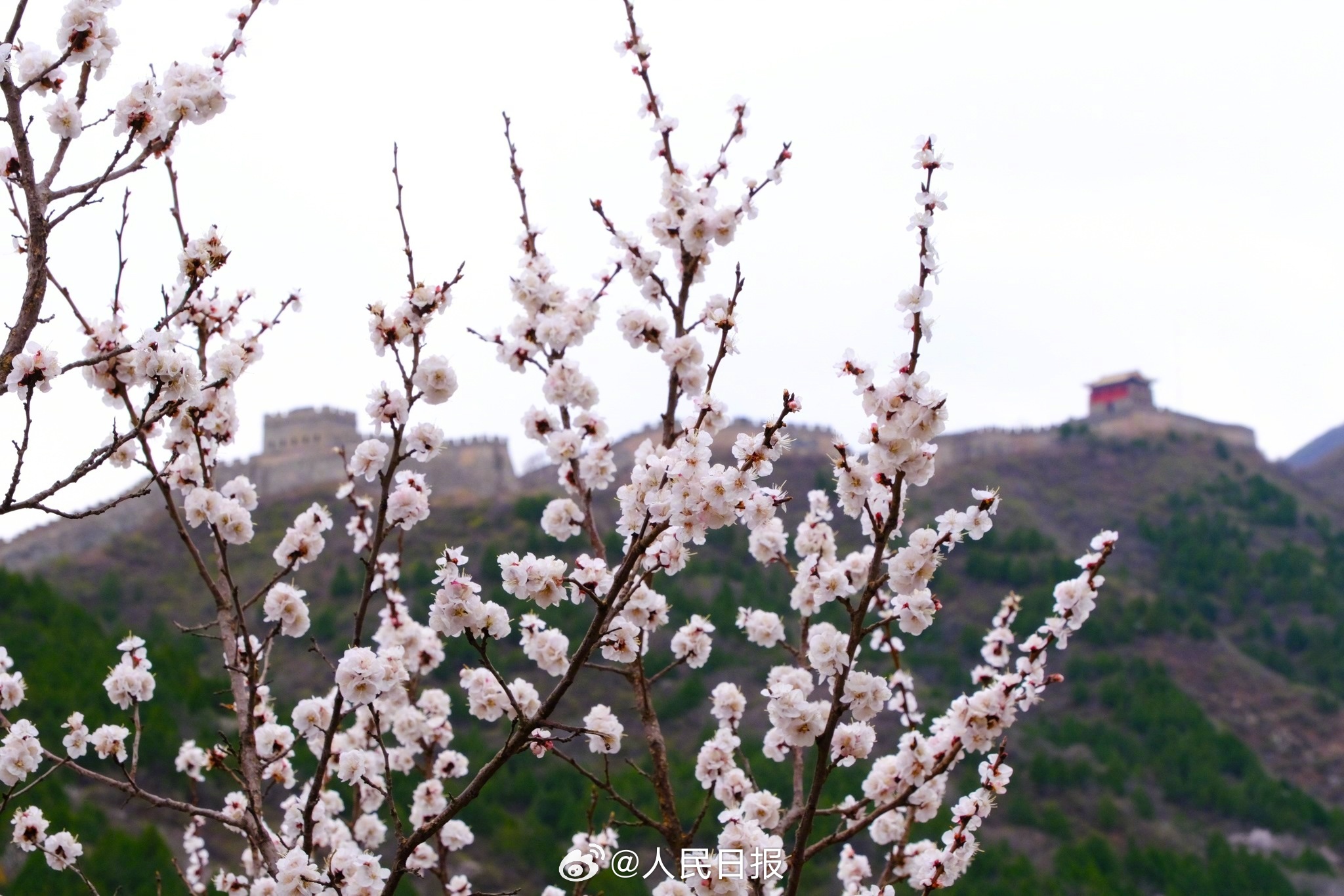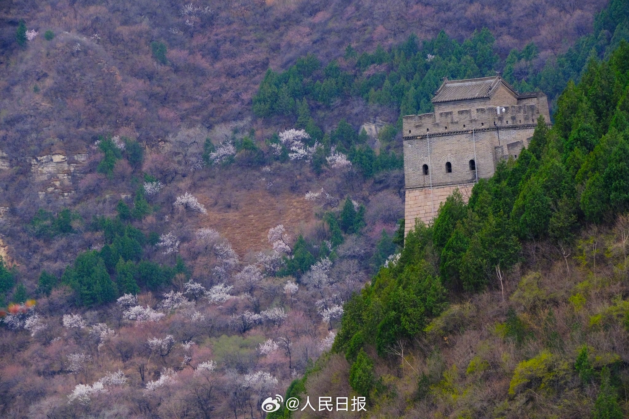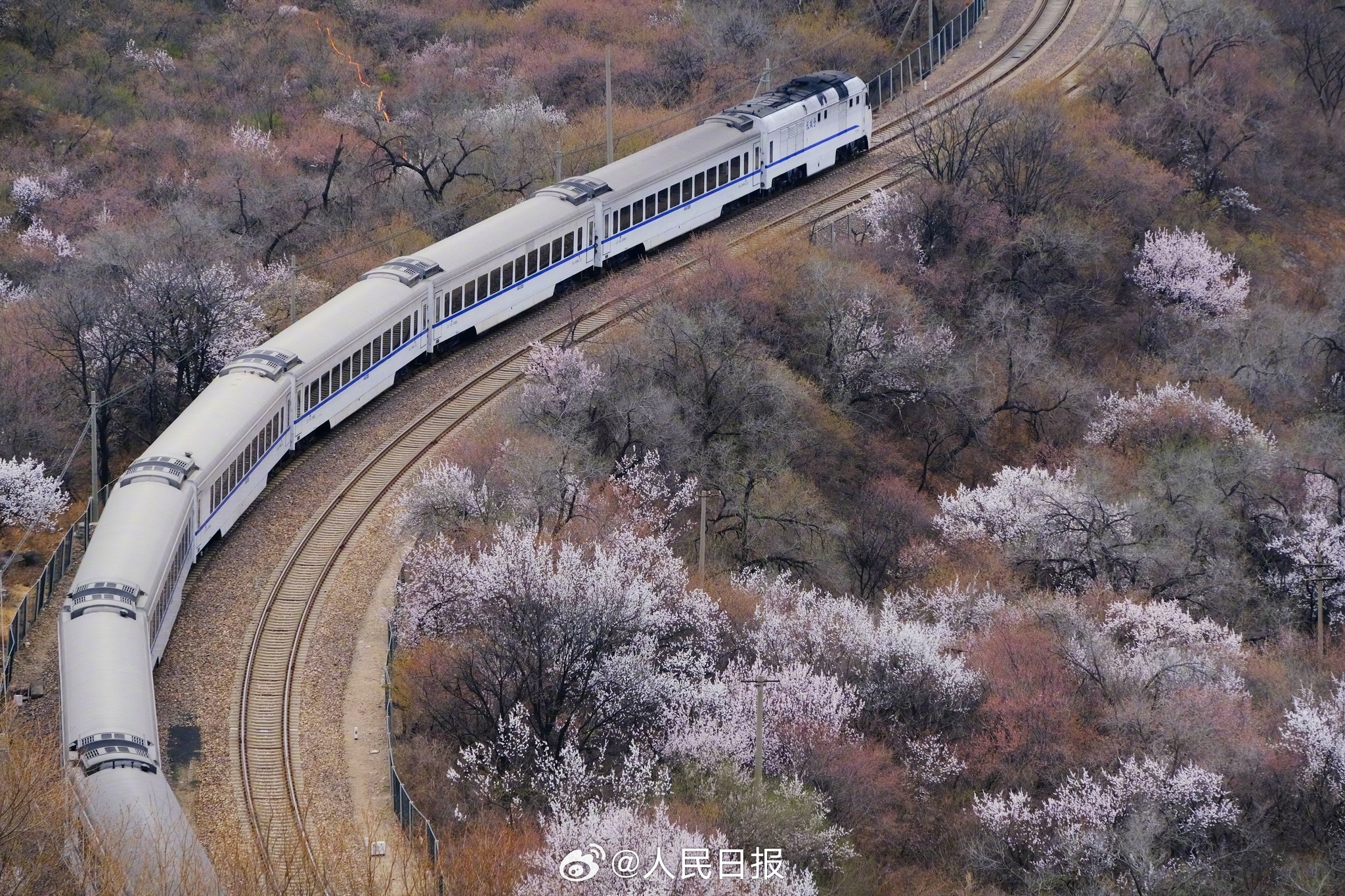 3月28日,北京居庸关花海栈道,近郊铁路S2线穿行花海之中,山桃花和山杏花盛放,成为春日绝佳拍照景点。
