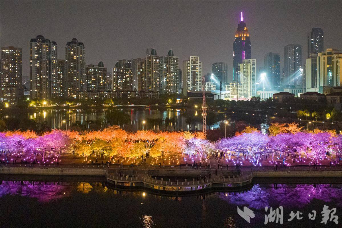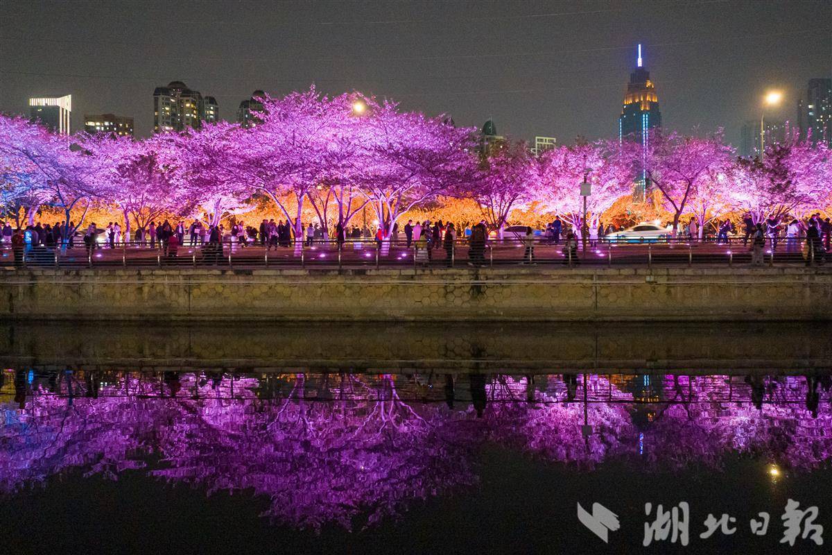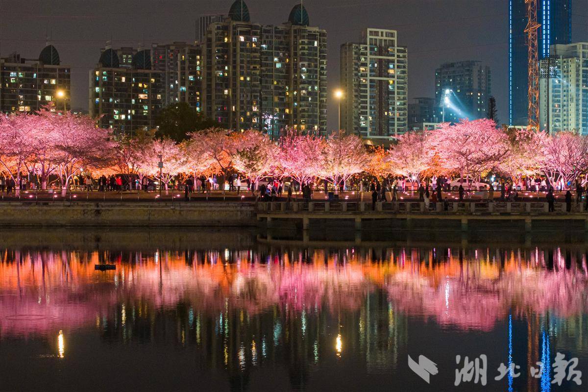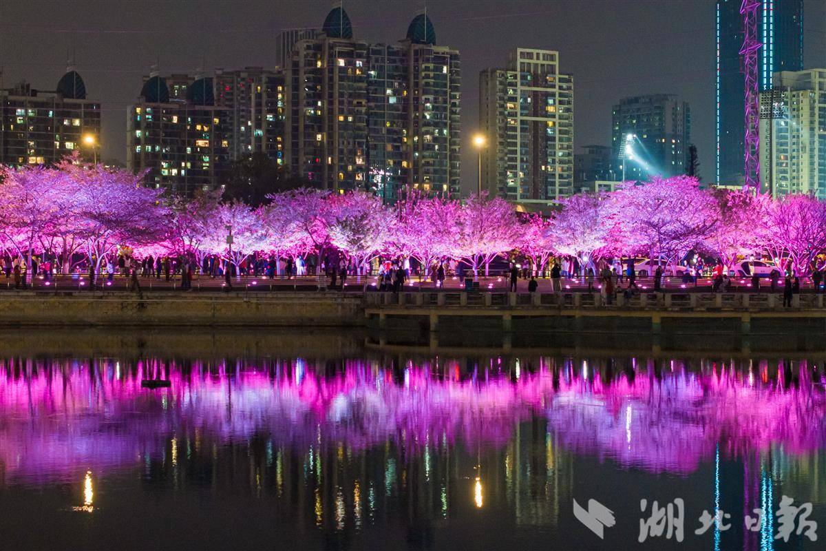 湖光映夜樱,灯火照花海!3月30日晚,武汉市西北湖公园千米樱花大道流光溢彩,景观灯将一棵棵花枝繁茂的樱花树点亮,樱花花瓣在光影中显得分外茂盛,众多游客在花树下流连拍照,镜头里定格下樱花与远处高楼幕墙流光相融的画面。(湖北日报全媒记者 任勇 摄)