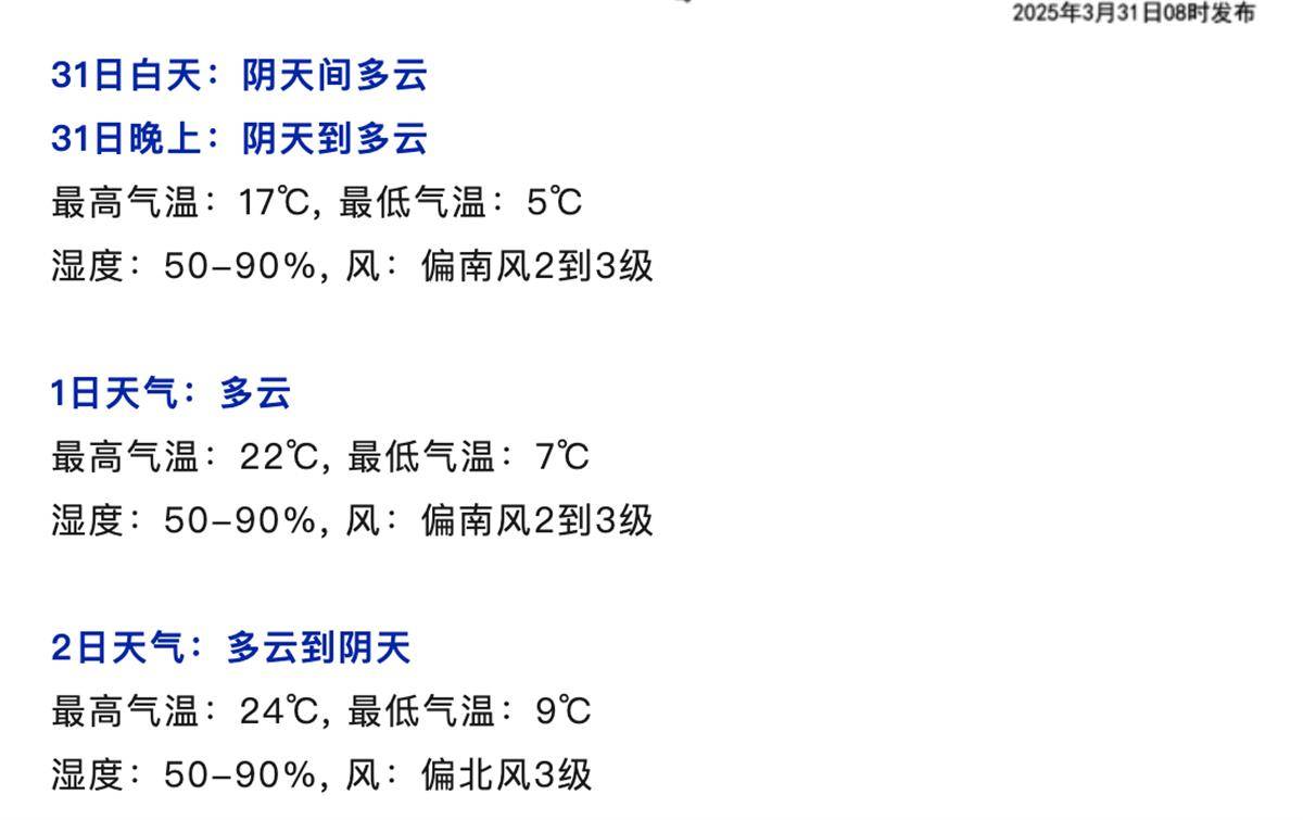 天气好,气温舒适,春暖花开的日子,特别适宜出游。武汉市气象局提醒,近期每天的温差都在10℃以上,春季昼夜温差大,请合理穿衣,以防感冒。预计3月31日起,武汉市以多云天气为主,无明显降水发生,气温逐步回升,森林火险气象风险高。