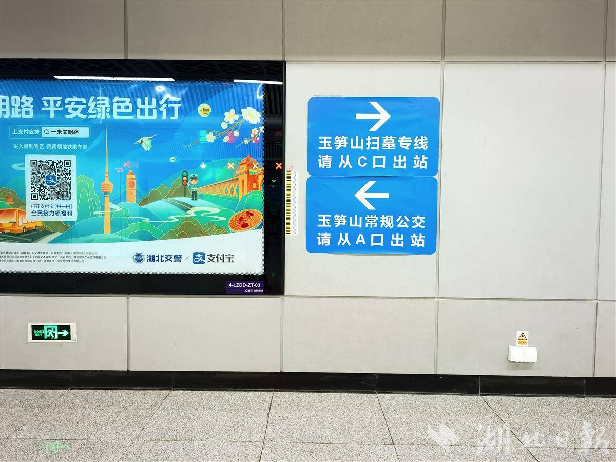 湖北日报讯(记者黄磊、通讯员鲁娟、廖瑜、肖玲瑜)3月30日,武汉公交清明祭扫专线开通的第二天,在地铁4号线临嶂大道站人行通道内,张贴着“玉笋山扫墓专线请从C口出站”“玉笋山常规公交请从A口出站”的醒目指示牌,现场还有公交工作人员在现场为乘坐扫墓专线的乘客指引路线,贴心服务赢得了乘客们的交口称赞。