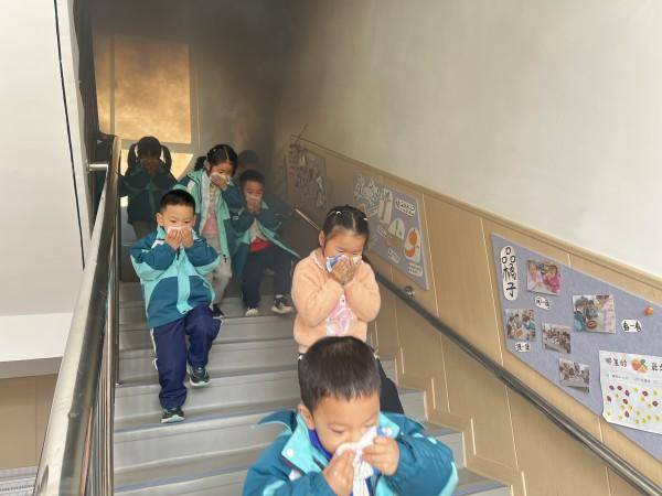 本次演练模拟真实火灾现场,在走廊和楼梯点燃“浓烟”,消防广播播放紧急通知,全体师幼立即停止一切活动,用湿毛巾捂住口鼻,弯腰低头,有序从安全出口紧急疏散至安全区域。