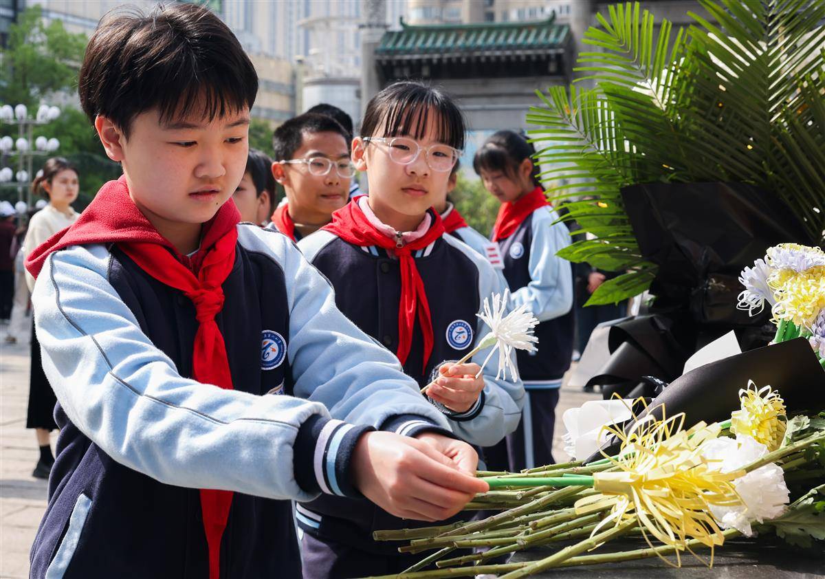 4月1日,在武汉市施洋烈士陵园,小学生在烈士墓碑前献花。