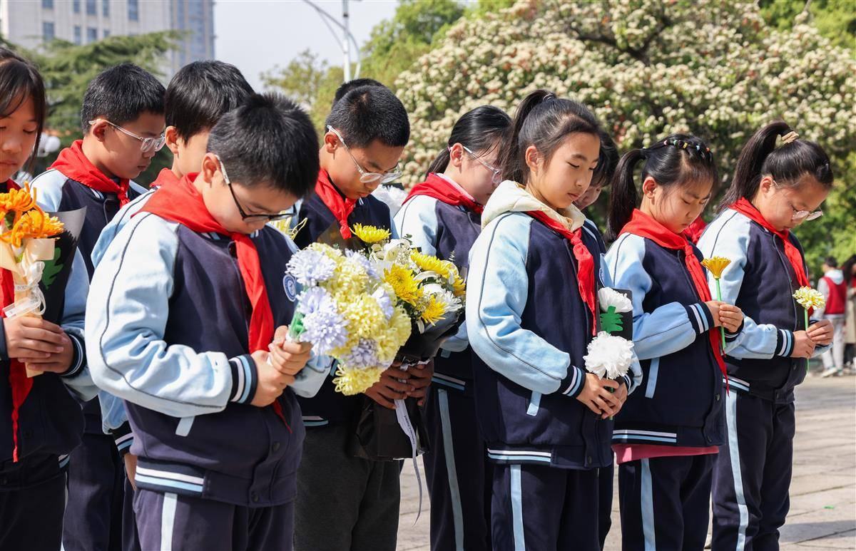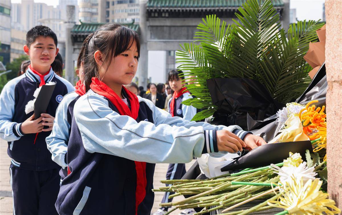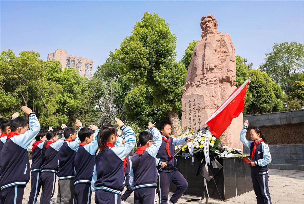 4月1日,在武汉市施洋烈士陵园,小学生们开展祭扫活动、缅怀英烈。