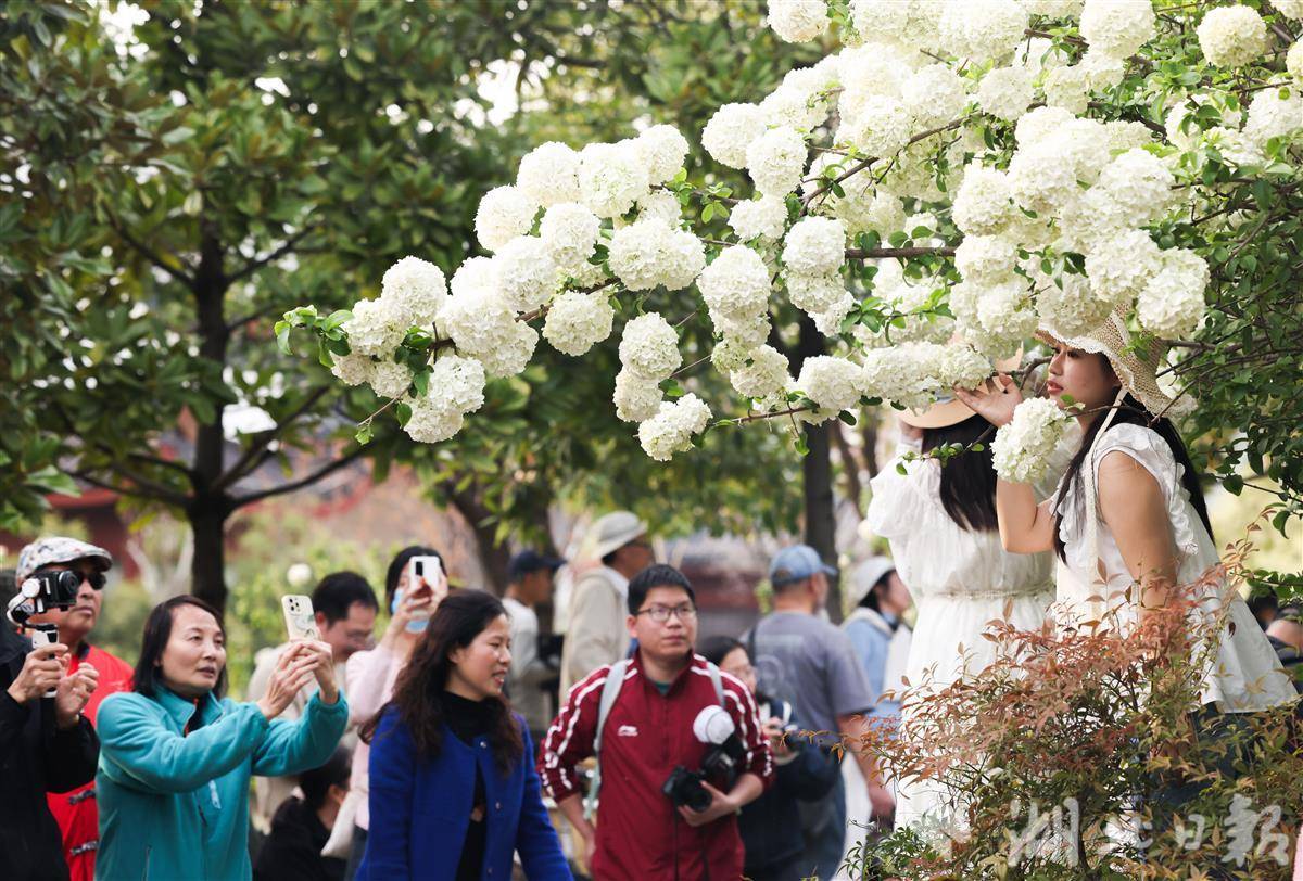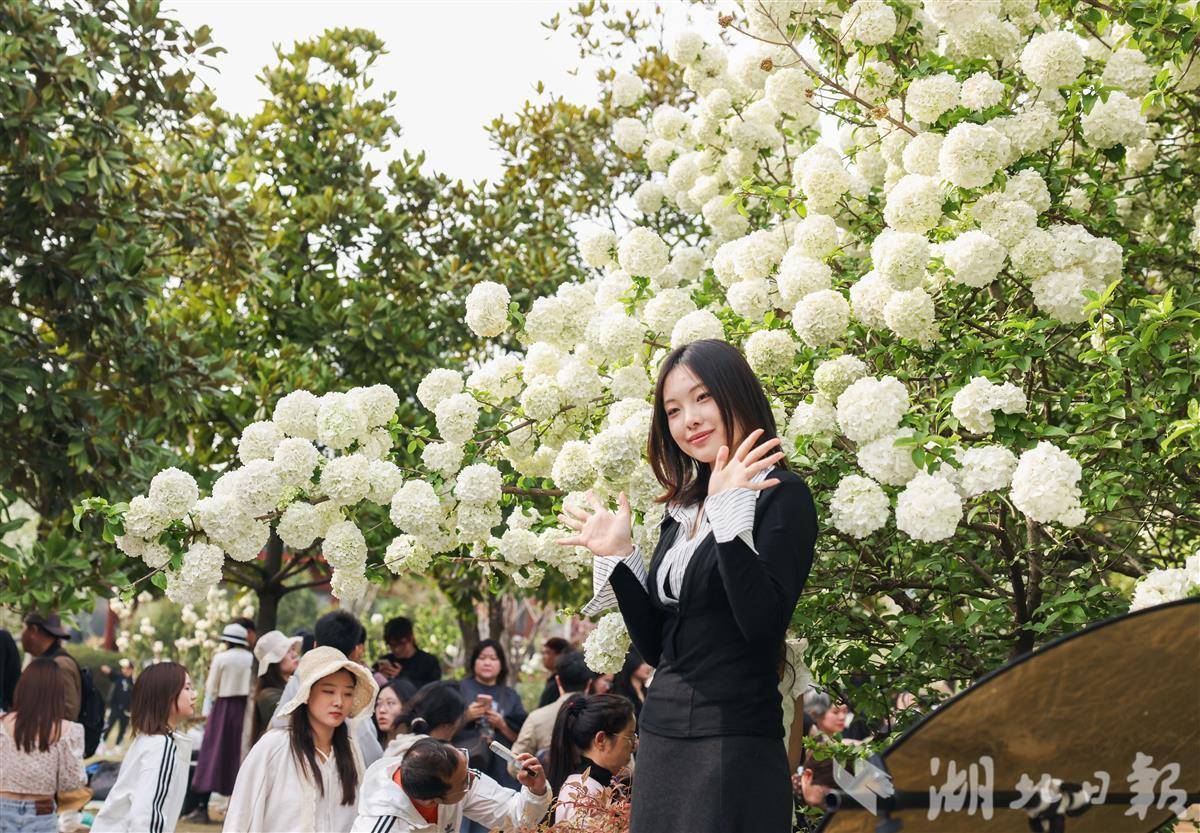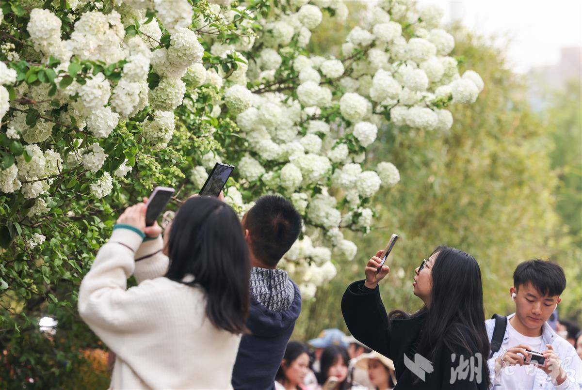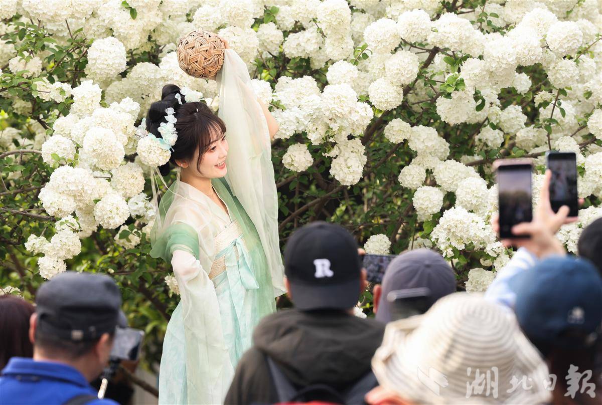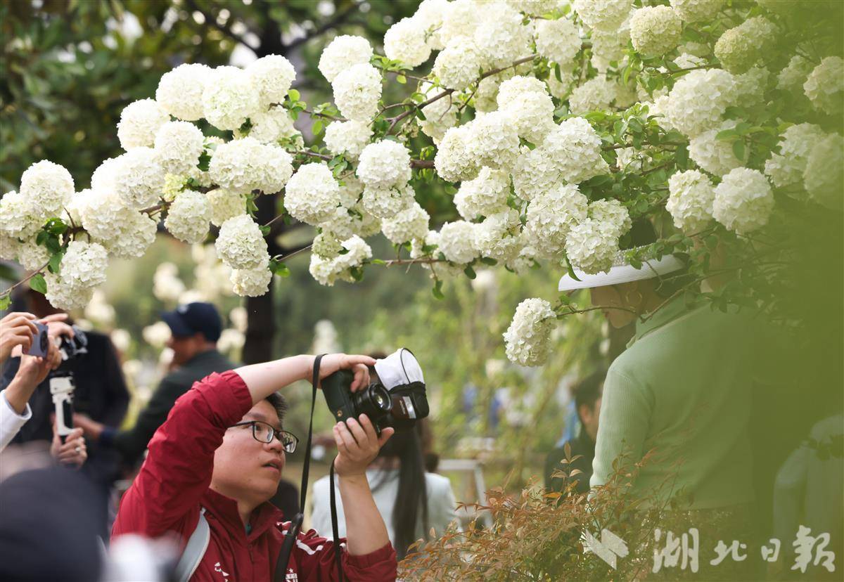 4月1日,武汉沙湖公园内百余株绣球盛放,一簇簇白色花团绽放枝头,吸引众多市民拍照打卡,感受春天的美好。