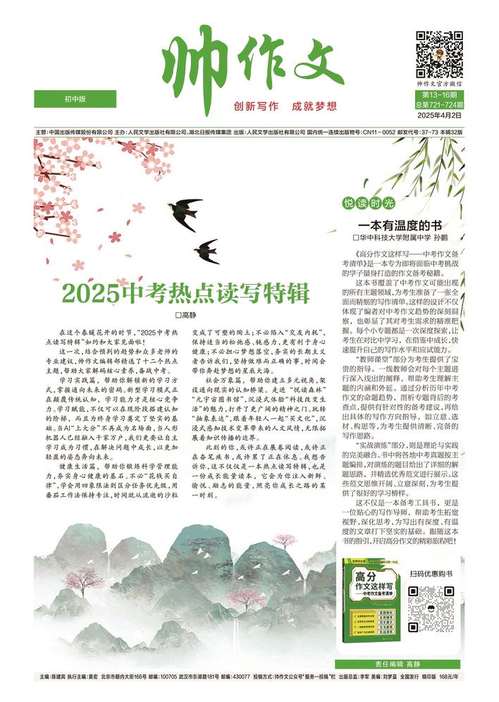 本次《帅作文》中高考读写特辑分别为《2025中考热点读写特辑》和《2025高考作文十大备考主题》,各有32个版面。读者可以在“帅作文”公众号底栏“书报订阅”栏目、“小帅文创”淘宝店铺等渠道,单独购买全彩印刷、纸质优良的中高考读写特辑精印版,定价20元。也可以在上述渠道,购买包含中高考读写特辑和2025年2月、3月《帅作文》的春季合订本(精印版),定价33.6元。关注帅作文视频号、抖音号,观看直播,还有惊喜福利、限时优惠等着你。