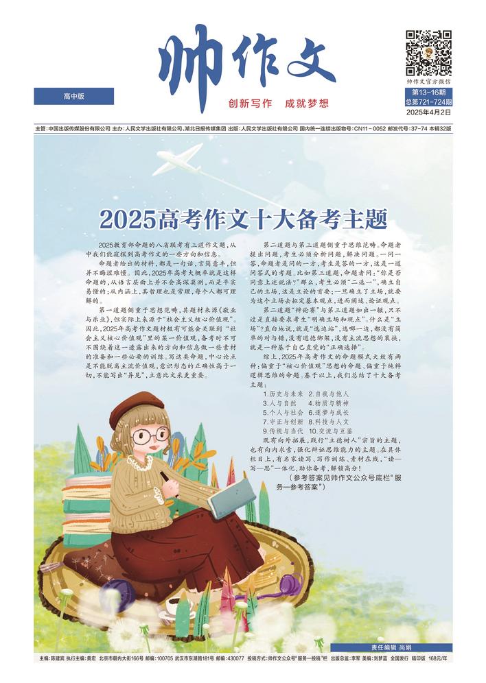 《2025高考作文十大备考主题》以“历史与未来”“自我与他人”“物质与精神”“守正与创新”等十个高考热门主题为切入口,精选美文、时评与素材,进行鉴赏与解读;结合2025年高考作文偏重于“社会主义核心价值观”、偏重于纯粹逻辑思维的命题趋势,提供最新作文题与该题的写作指导、优秀作文。该特辑不做素材堆砌,重在读写结合,让高中生读者在备考过程中不走弯路,事半功倍。