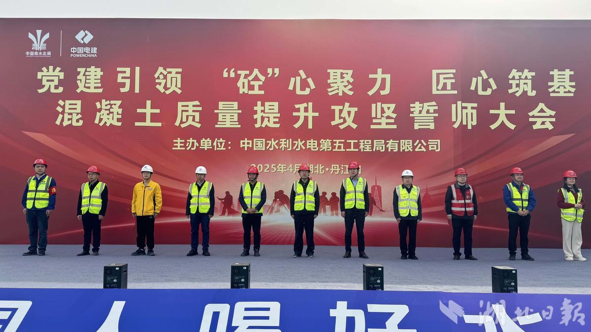 湖北日报客户端讯(通讯员左宇淞)4月2日,丹江口市三官殿办事处境内,党建引领、“砼”心聚力、匠心筑基,混凝土质量提升攻坚行动誓师大会在引江补汉出口段项目隆重举行。