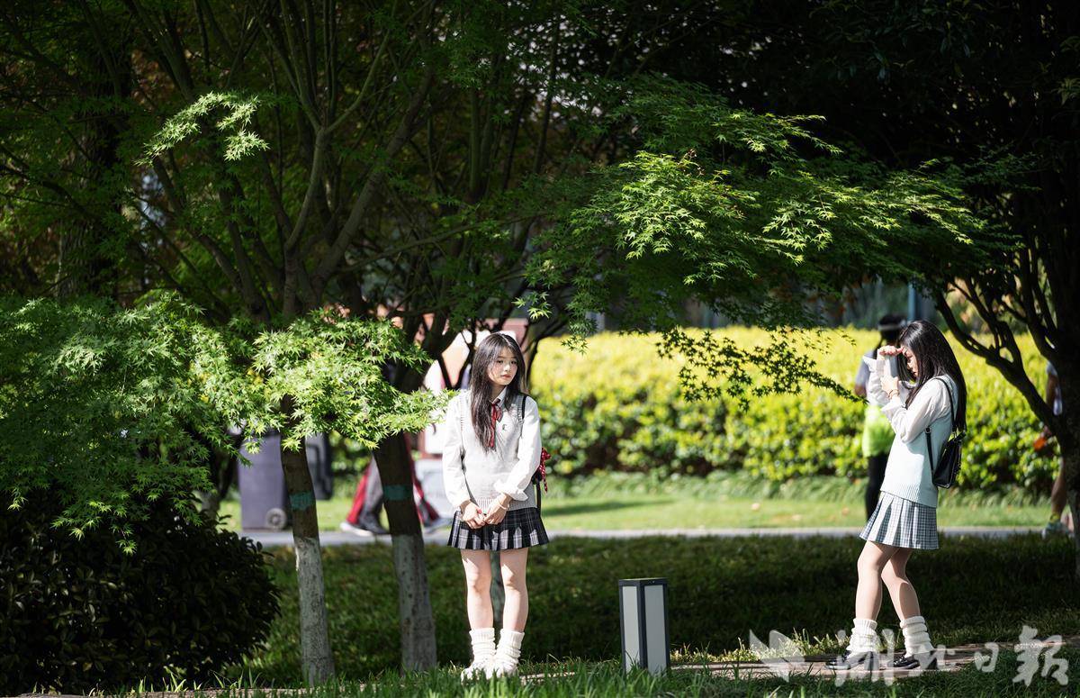 4月5日,清明假期第二天,两名女孩在东湖绿道拍照打卡。(湖北日报全媒记者 任勇 摄)