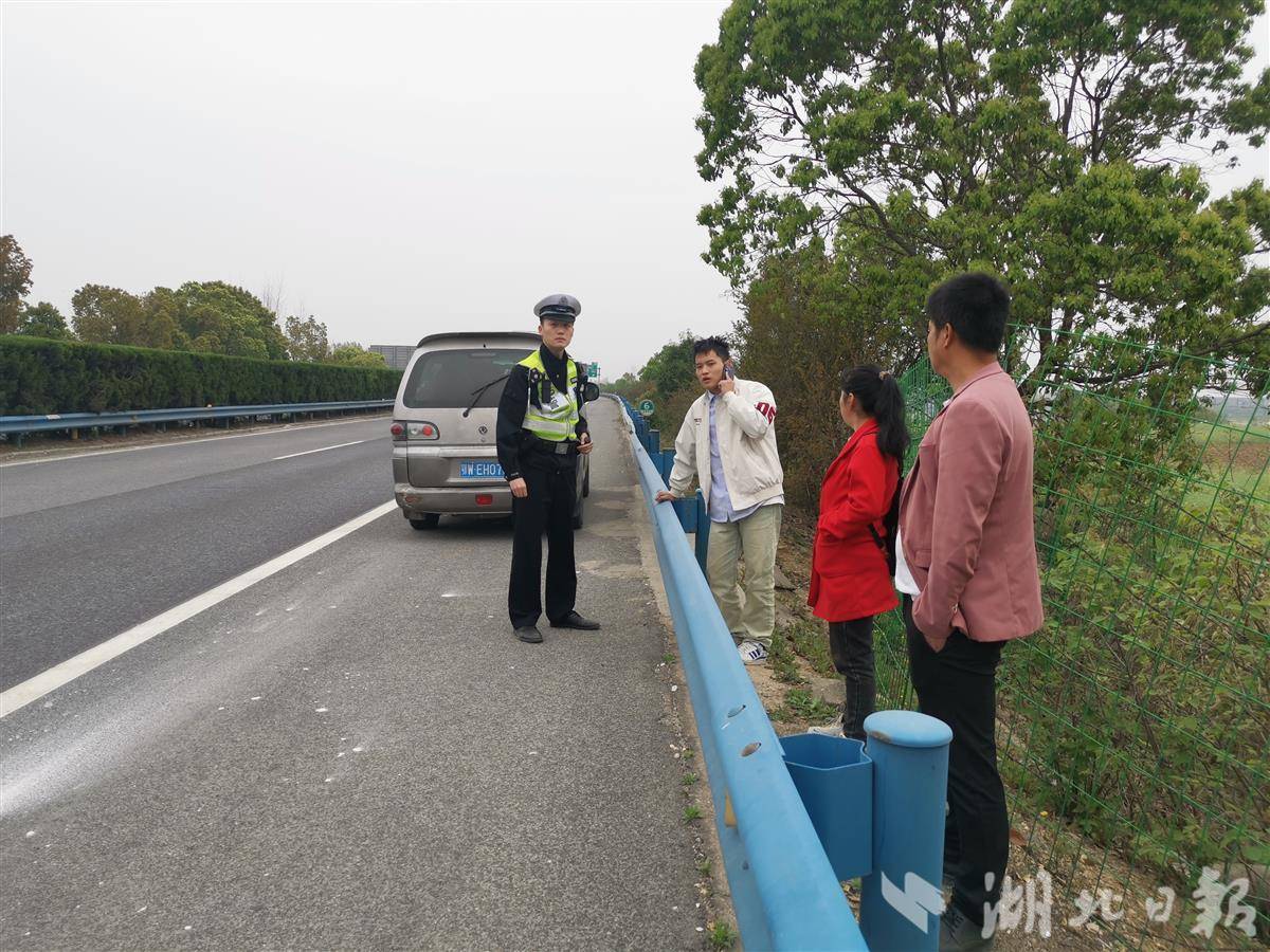 4月4日,省公安厅交通管理总队高警黄州大队民警徐立昂、李洋在路面巡逻。8时20分许,巡逻至大广高速新洲段时,发现应急车道上停靠着一辆面包车,车旁还站着三个人。