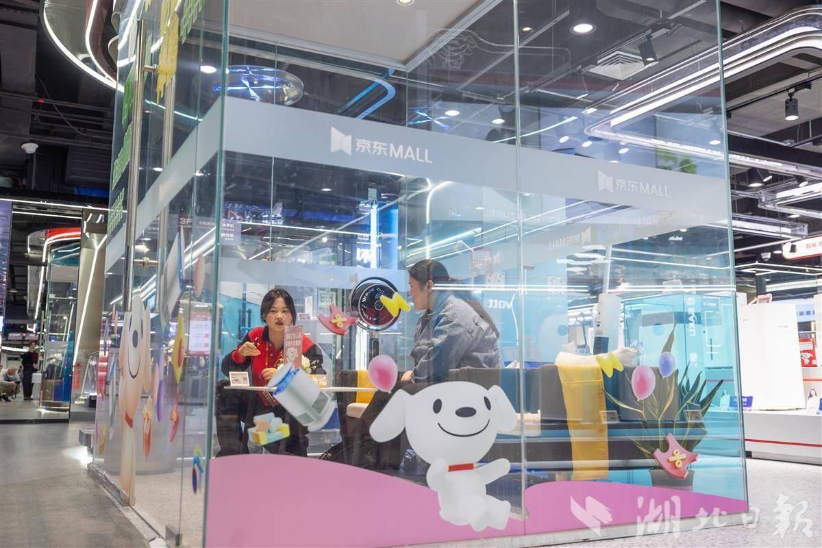 4月12日,武汉京东MALL空气净化器销售专区,工作人员向顾客介绍产品信息。