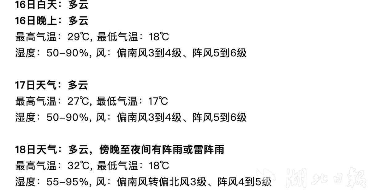 湖北日报讯(记者汤炜玮、通讯员陈声超)4月16日从武汉市气象局获悉,预计未来三天,武汉市持续以多云为主的天气,白天偏南阵风较明显,火险气象等级较高,野外踏青郊游注意管理好火源,防范森林火灾。