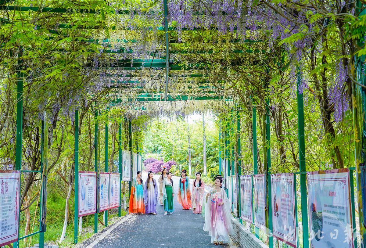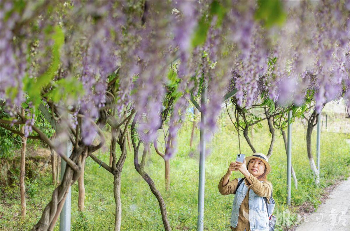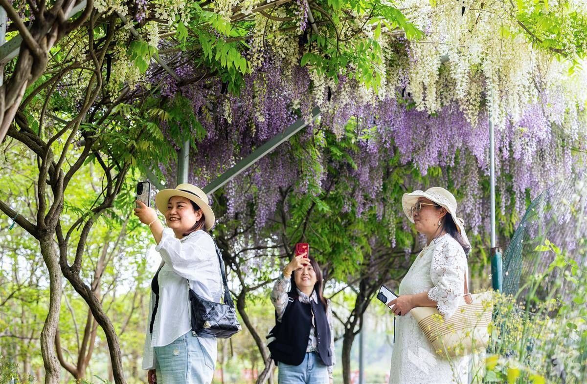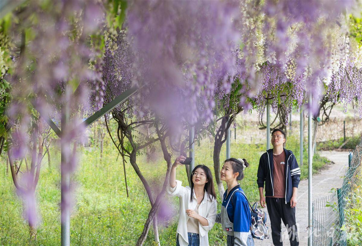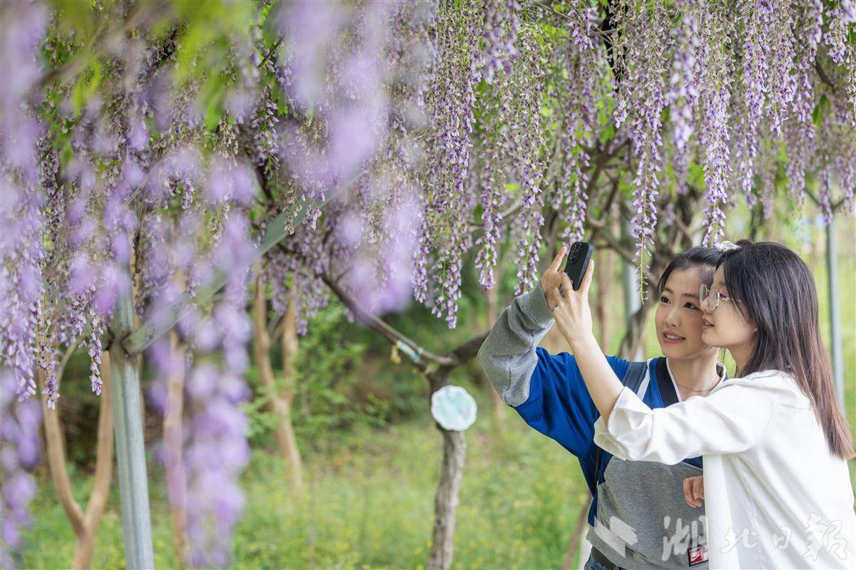 4月16日,黄石还地桥镇三华生态园内,紫藤花迎来盛放期,淡紫色花穗如瀑布垂落,游客们在花架下拍照留念。近年来,当地坚持以花兴旅、以旅促农,通过打造“赏花+”多元消费场景,将生态“颜值”转化成振兴“产值”。
