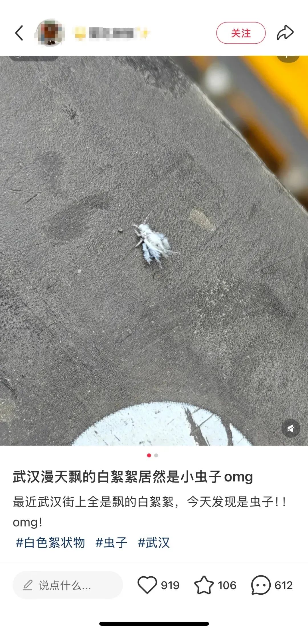 当日值班专家、武汉市园林绿化建设管理站站长陈曦接诊后判断,这是一种名为朴绵叶蚜的飞虫,喜欢寄生在宿主朴树上。每年春天,朴绵叶蚜会迁飞寻找新的朴树宿主,这一过程看上去就像柳絮纷飞。