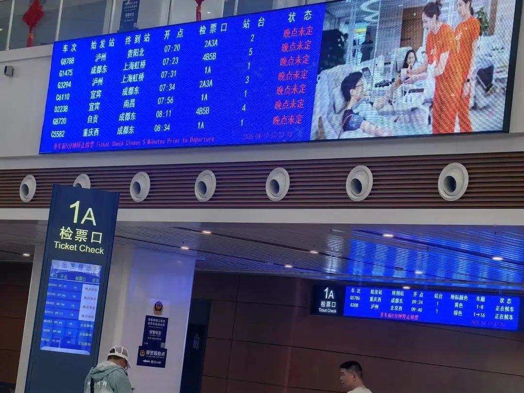 在社交媒体平台上看到,一些网友发布了列车晚点的图片。上午9时多从成都东开往上海虹桥的G1478次、从泸州开往西安北的G1574次,都出现了70分钟以上的晚点。其中G1478次途经的湖北襄阳东站,车站大屏显示晚点时间预计已达193分钟。