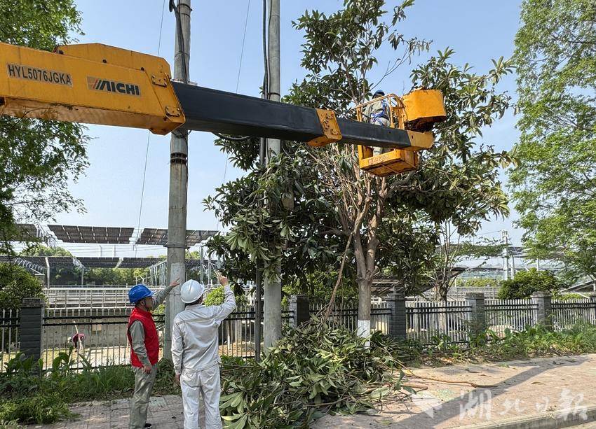 “鄂电红马甲”徐俊迅速部署施工方案,一方面组织外勤班治理厂区专变配电设备周边的树枝,另一方面向公司申请调派带电作业斗臂车支援专线下廊道的清理。在经过3个多小时的连续作业后,危及污水处理厂专变线路安全的树障被彻底清除。