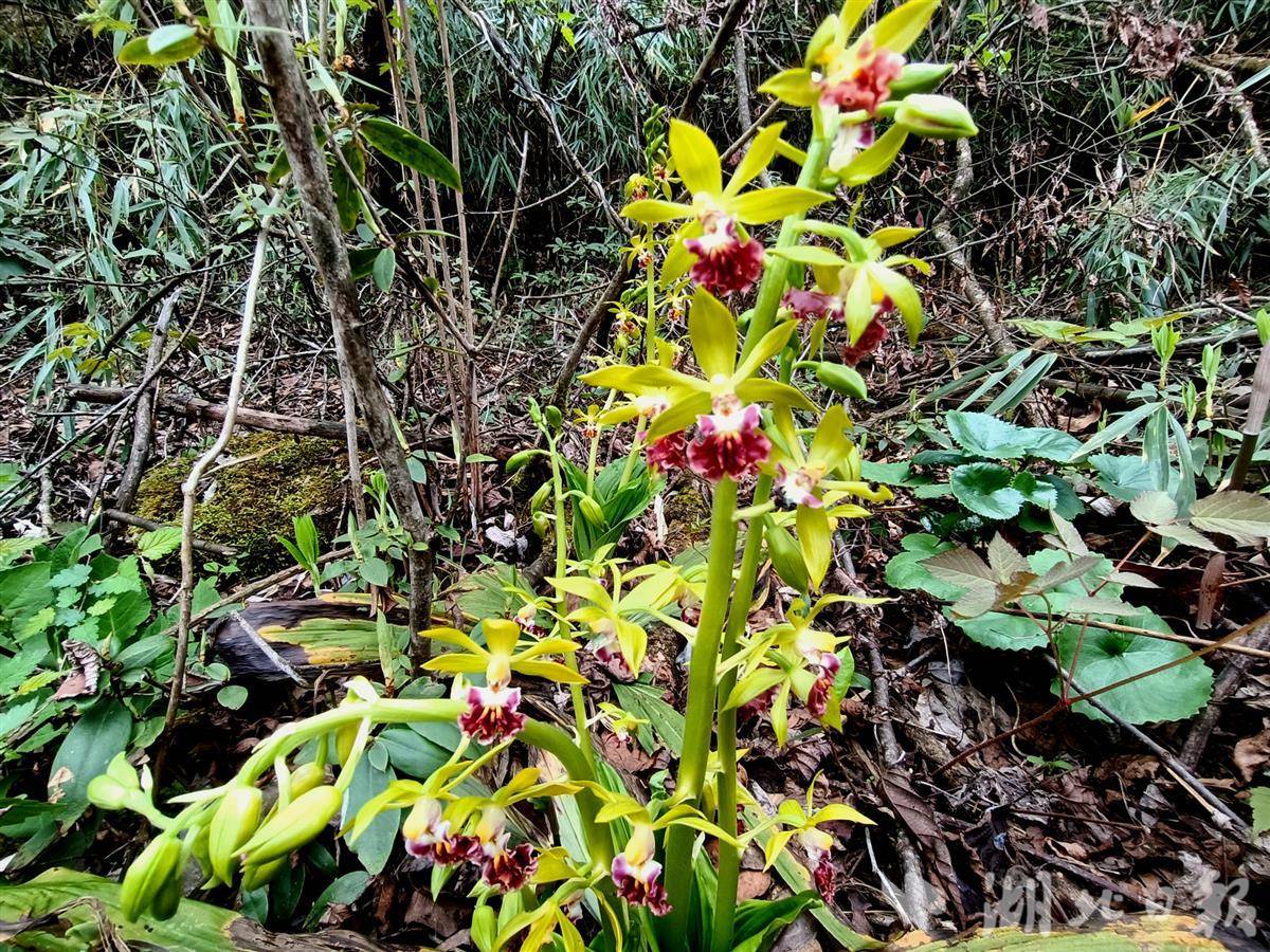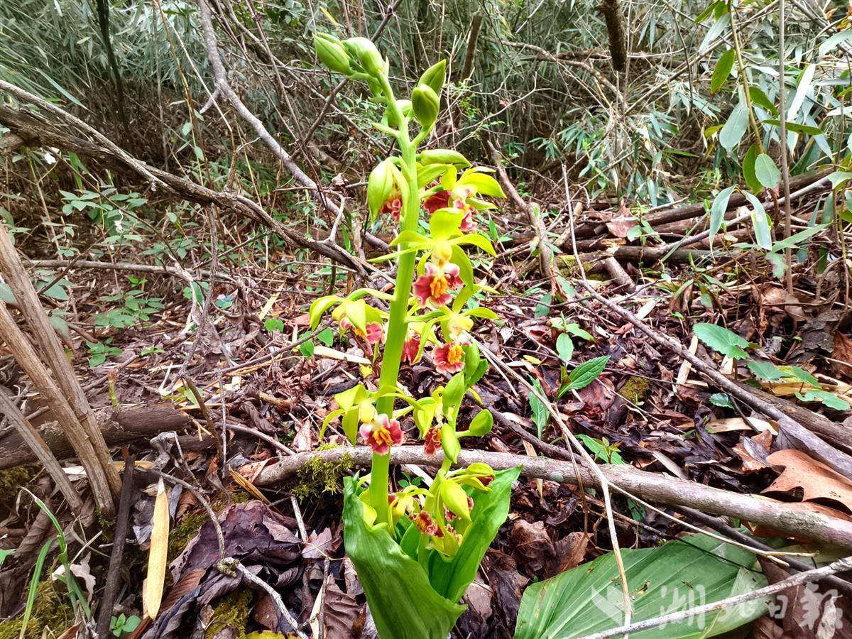 这几株三棱虾脊兰位于海拔1900米的混交林中,生长在潮湿的落叶层与枯枝杂草交织的阴坡地带,一簇簇高约30厘米的三棱虾脊兰正悄然绽放。淡紫色的花序如流苏般垂落,棱状突起的假鳞茎特征显著。
