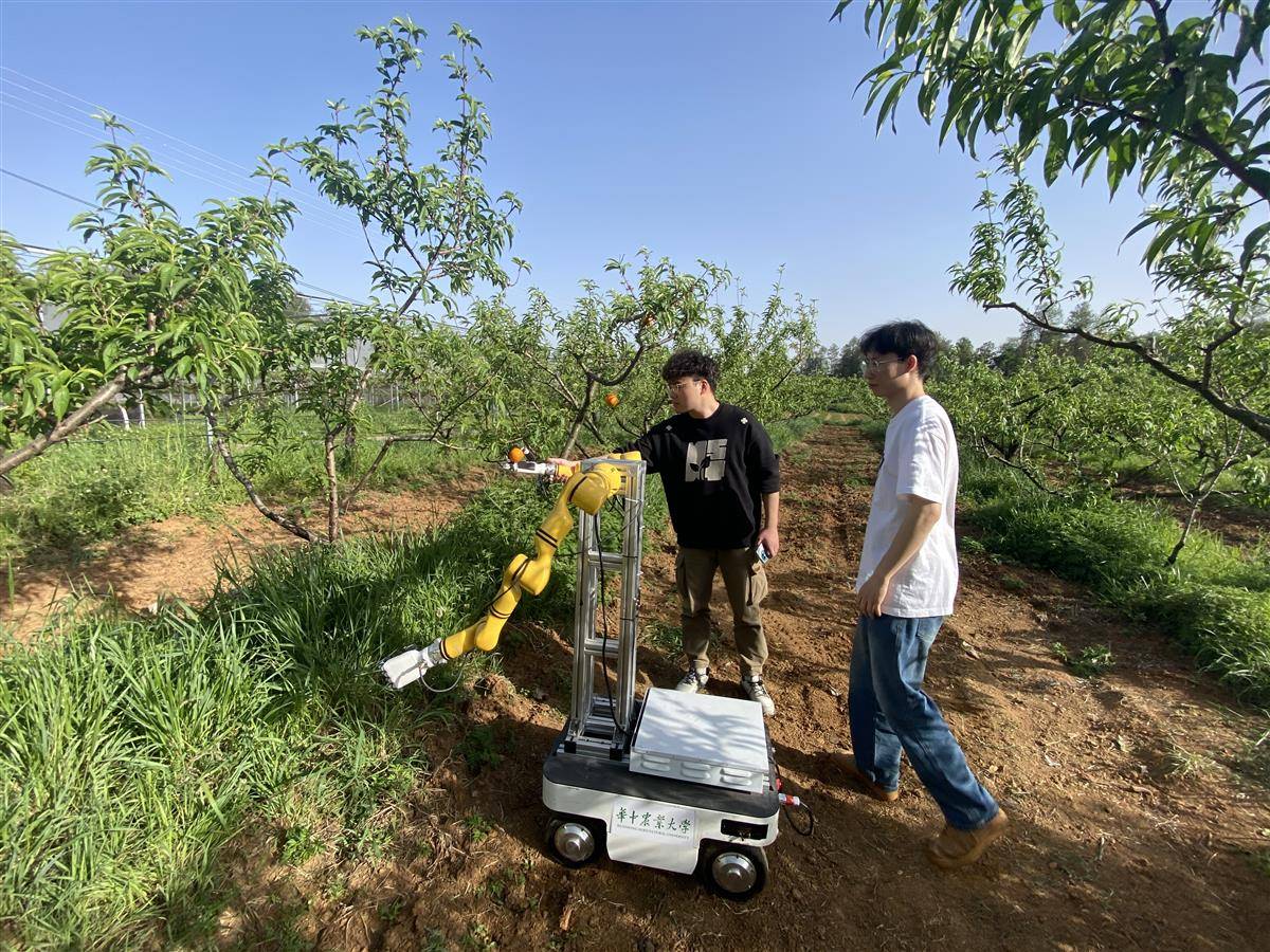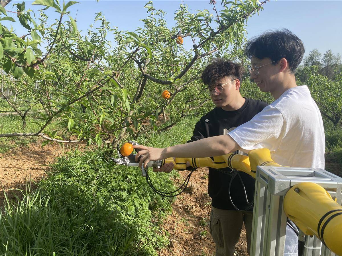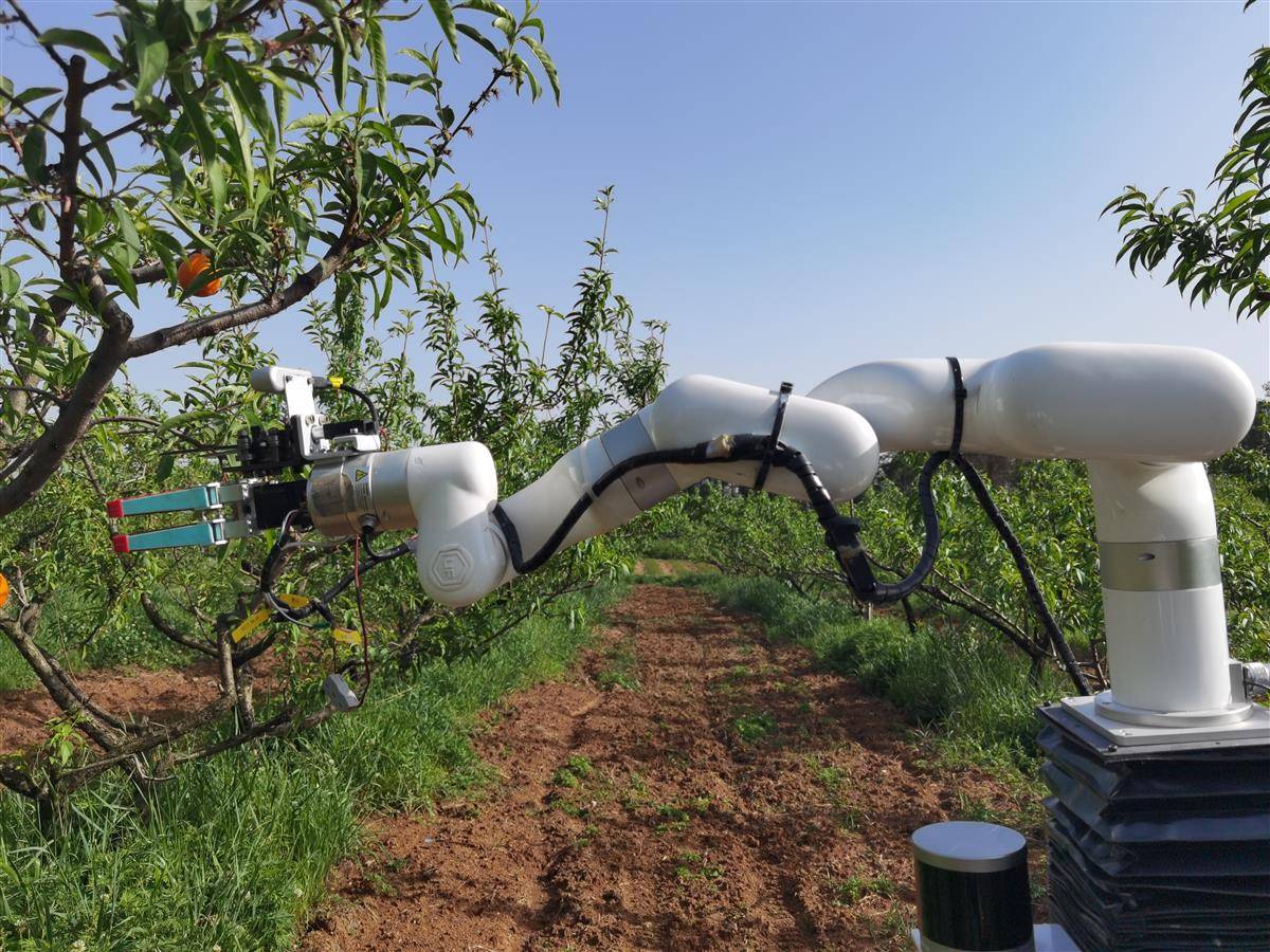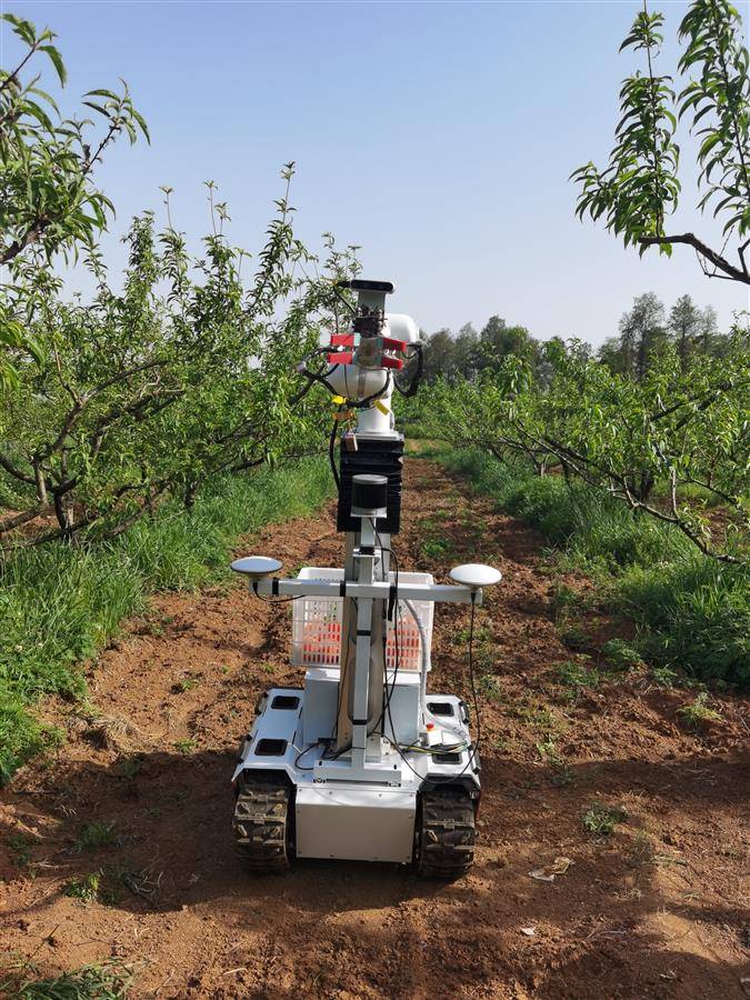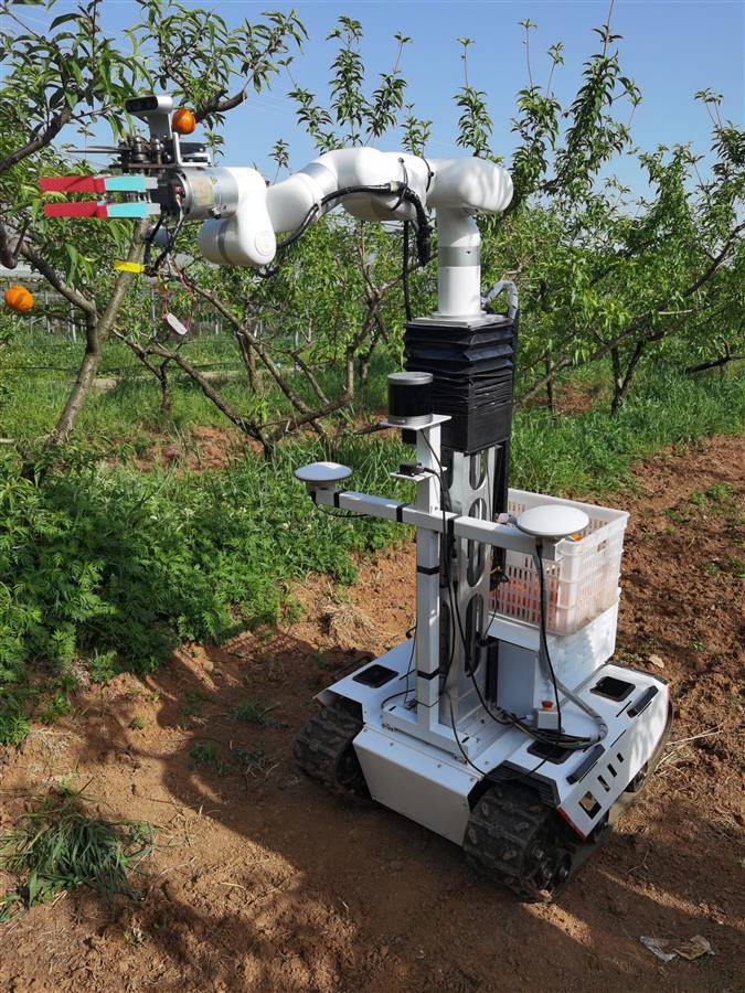 机器人的“爪子”采取的是剪切夹持一体化装置,先抓后剪,分两步完成采摘过程。科研人员通过反复力学试验,找到最佳握力值,让机器人的采摘力度刚刚好,不伤果。它的动力装置用的是新能源电池,充一次电能够工作6小时。