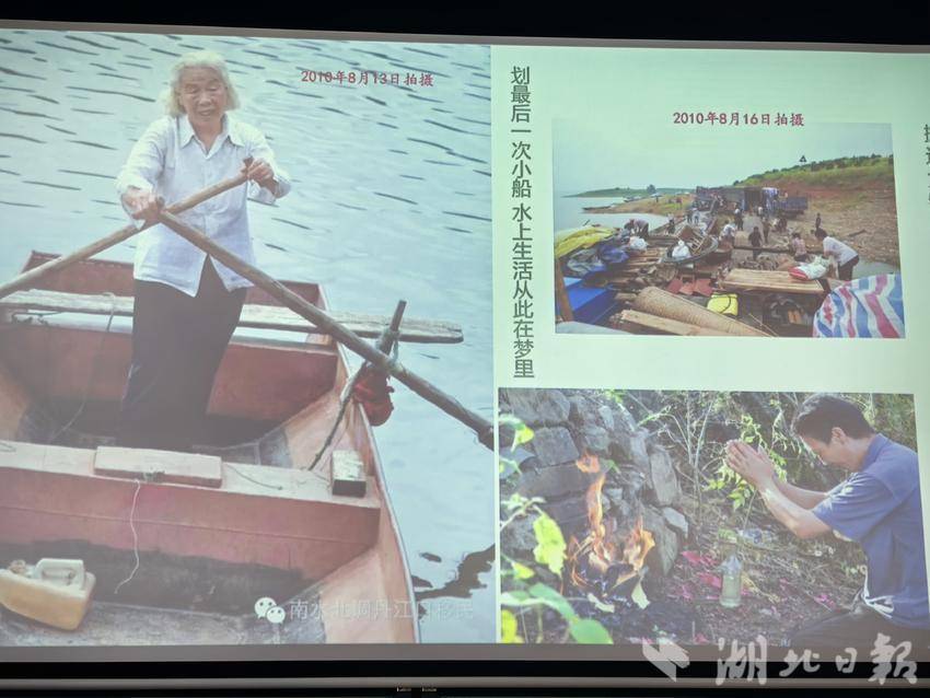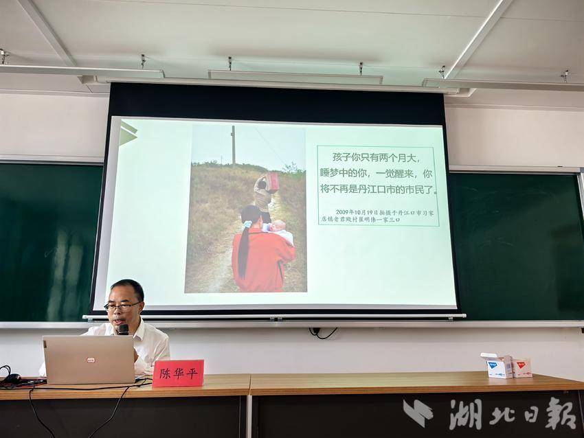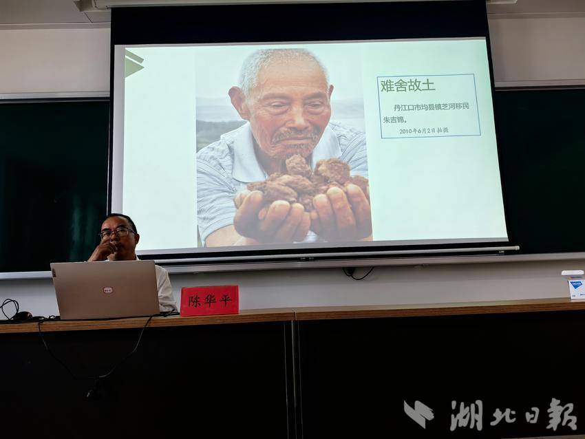 泛黄的照片在投影屏上渐次展开:1969年丹江口大坝建设首批移民背着铁锅棉被走向荒野的背影,2009年为南水北调中线工程二次搬迁时村民跪别祖坟的瞬间,移民干部写满农户家庭需求的笔记本特写……陈华平老师特意选取了32组对比影像。“从油灯到电灯,从土坯房到新社区,照片里藏着看不见的牺牲——3个县城、36个乡镇的70万群众,用两次搬迁成全了半个中国的饮水安全。”