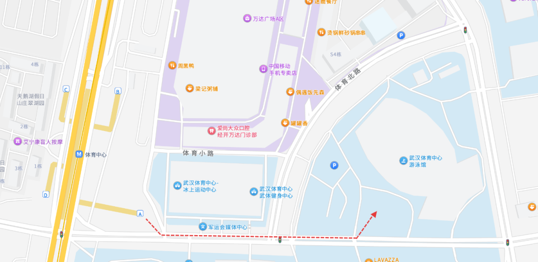 地铁:武汉地铁3号线体育中心站A出口步行约300米至武汉体育中心游泳馆