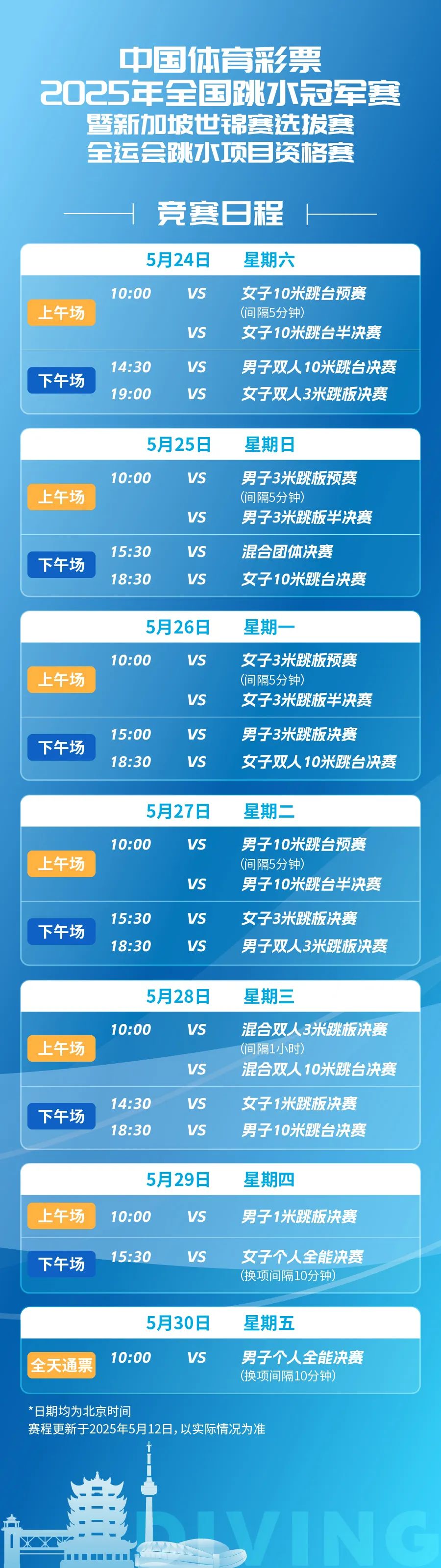 中国体育彩票2025年全国跳水冠军赛暨新加坡世锦赛选拔赛、全运会跳水项目资格赛门票,可通过“大麦”官方APP、猫眼官方APP以及票星球官方APP或小程序购票,精彩不容错过!欢迎广大跳水爱好者亲临比赛现场,共同见证!