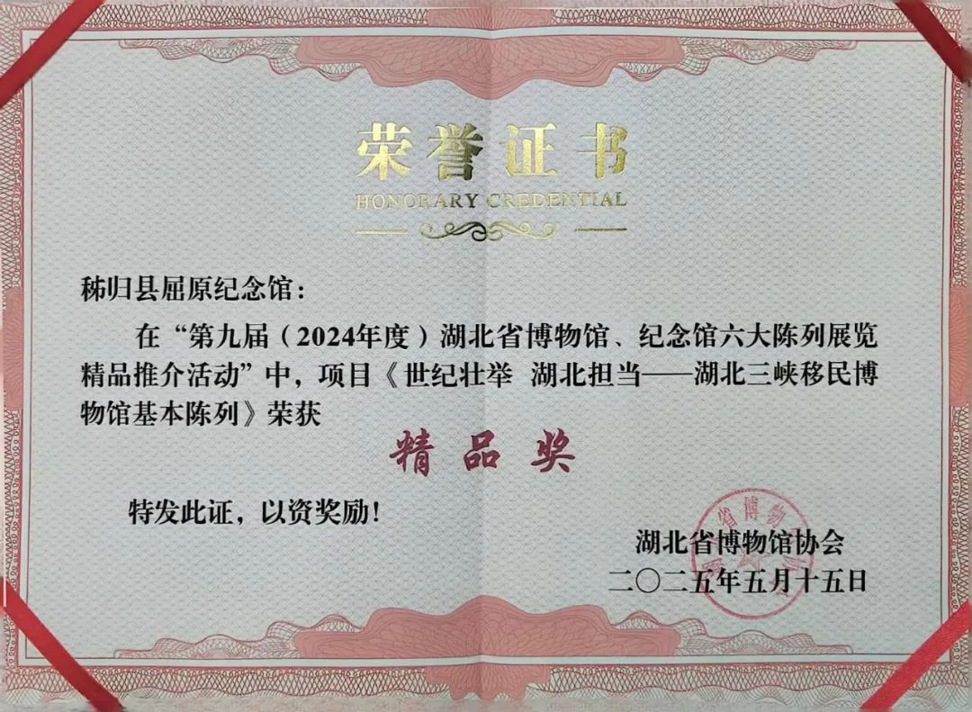 5月16日,在2025国际博物馆日湖北主会场活动中,秭归县屈原纪念馆、湖北三峡移民博物馆基本陈列荣获第九届(2024年度)湖北省博物馆、纪念馆六大陈列展览精品奖。