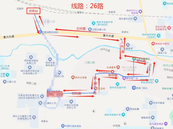 原行驶路线:荆应线—西环路—凤凰路—演武路—四机路—郢都路—荆中路—屈原路(荆北路—拥军路)