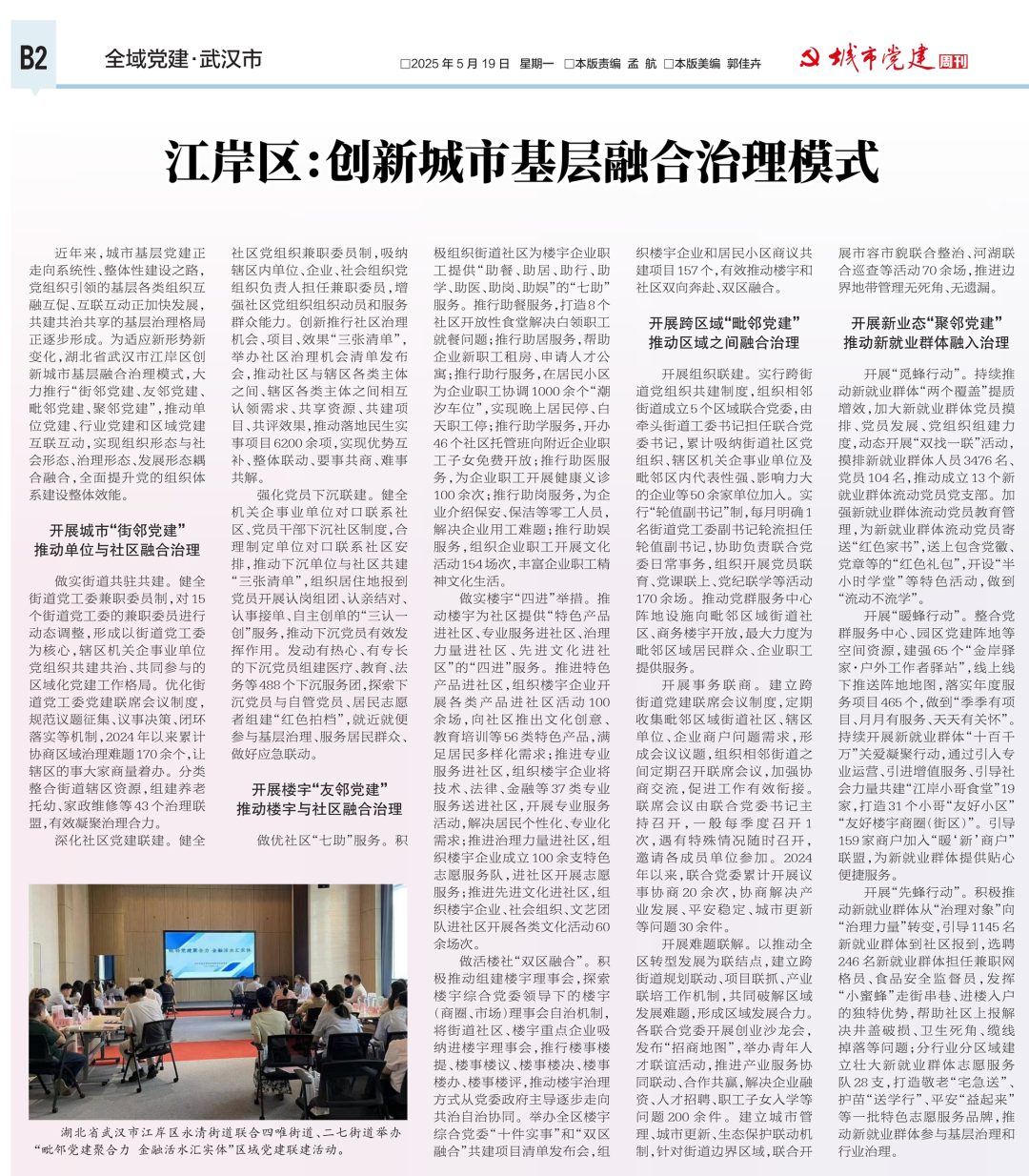 近日,人民日报社《城市党建周刊》整版刊发《江岸区:创新城市基层融合治理模式》,介绍江岸区探索城市“街邻党建”、楼宇“友邻党建”、跨区域“毗邻党建”、新业态“聚邻党建”,推动单位与社区、楼宇与社区、区域与区域、新就业群体与社区融合治理,全面提升党的组织体系建设整体效能的经验做法,现将文章刊载如下: