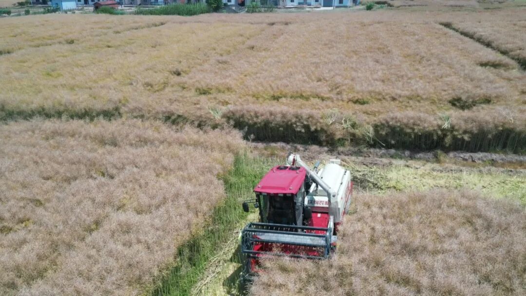 在夏日微风的吹拂下,马家寨乡的油菜田荡起金色的涟漪。伴随着油菜收割机的轰鸣声,一排排油菜被整齐收割、脱粒、分离,菜籽壳和秸秆被粉碎后直接抛洒还田,实现秸秆绿色循环利用。