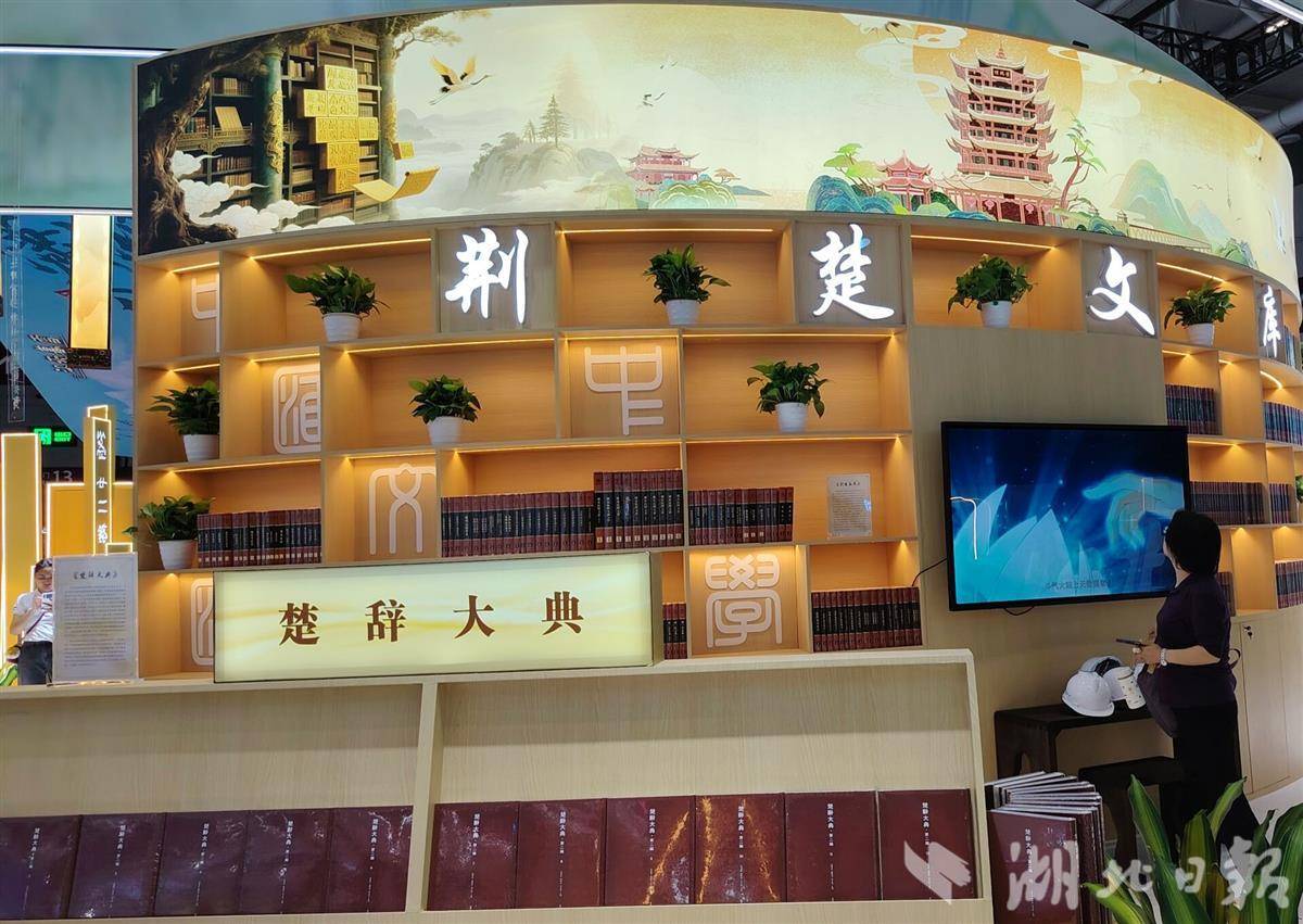 湖北馆专设了“典籍生辉”展区,由《荆楚文库》《楚辞大典》、“三大奖”图书和触摸屏影视作品等组成。