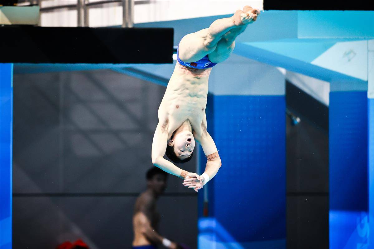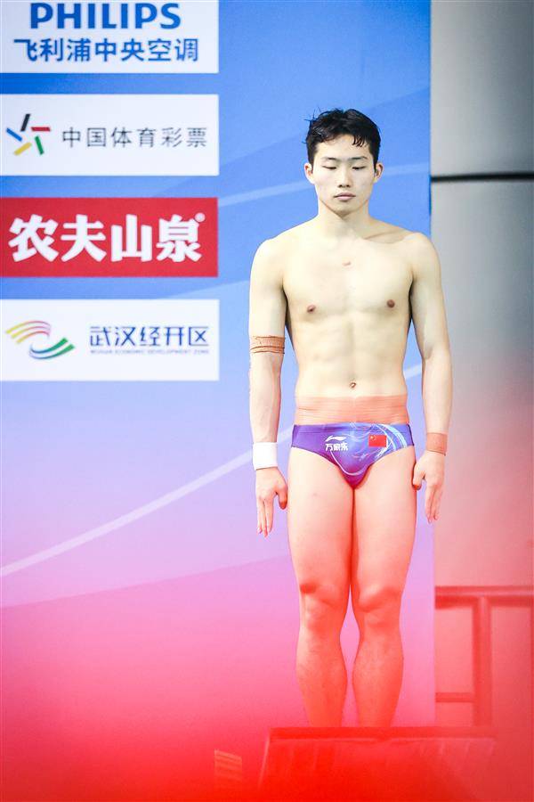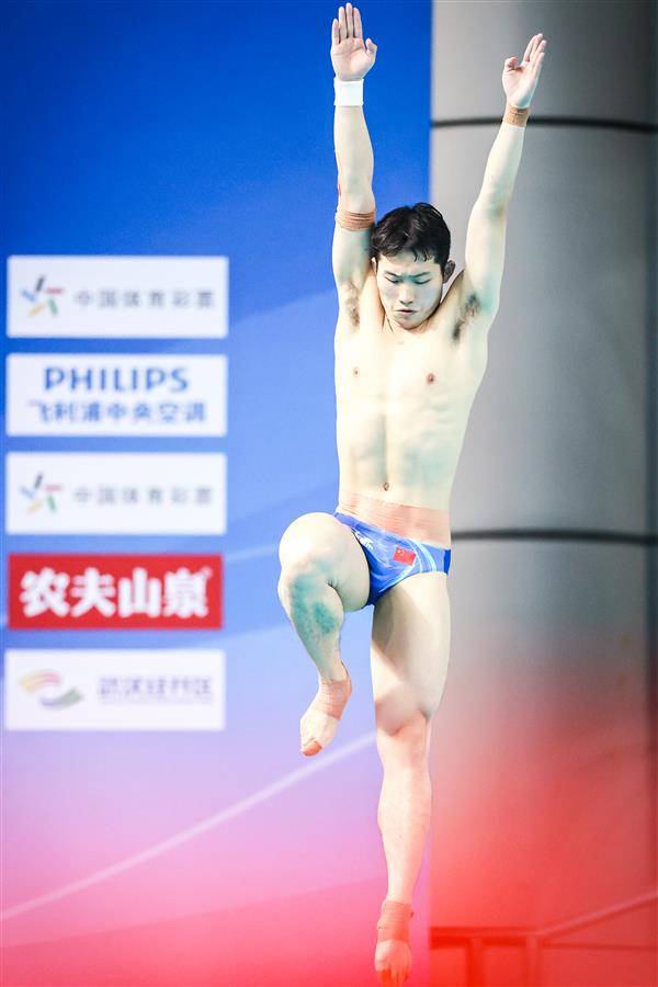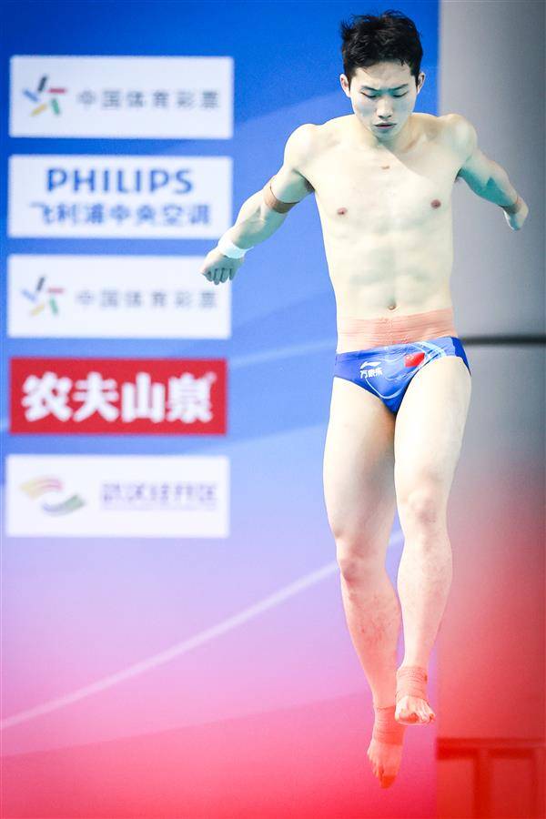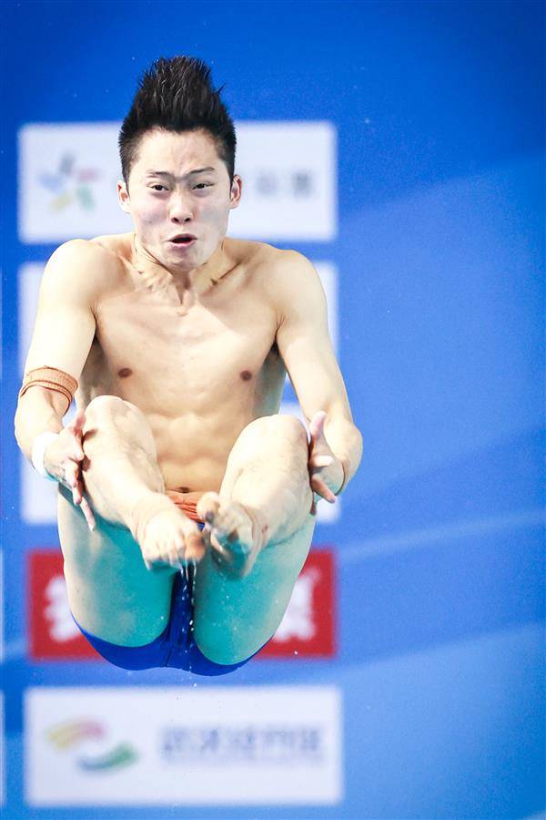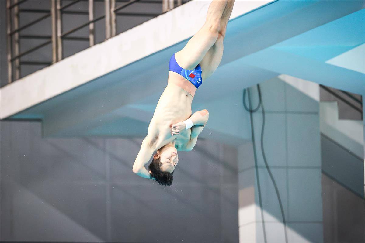 5月25日,武汉体育中心游泳馆,全国跳水冠军赛男子3米板半决赛,奥运冠军、湖北选手王宗源以557.45分(领先第二名33.35分)、排名第一的成绩晋级26日15时开赛的决赛。(湖北日报全媒记者 时龚 摄)