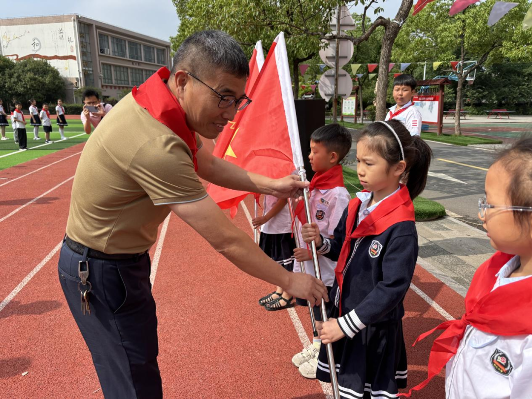 郝穴小学少工委主任余辉和副主任王敏为新建中队授予中队旗,这不仅是旗帜的传递,更是责任的传承。