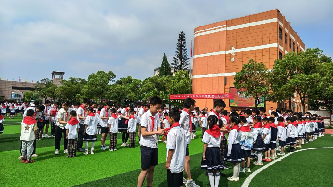 六年级少先队员为新队员佩戴上鲜艳的红领巾。这不仅是标志的传递,更是责任与使命的传承。