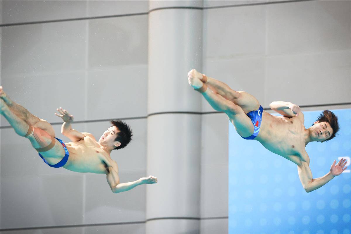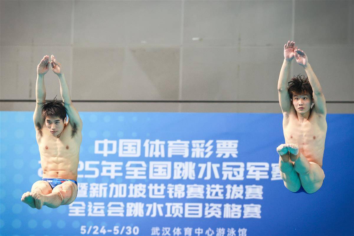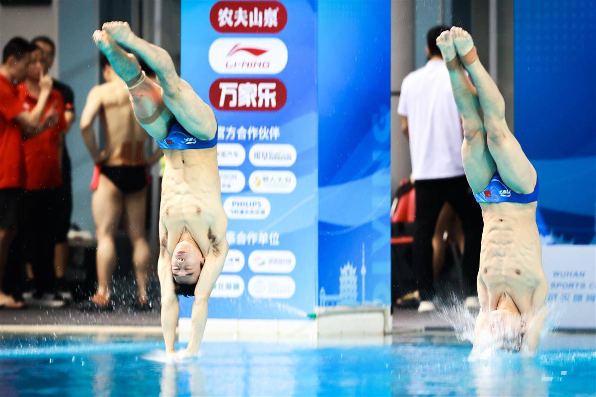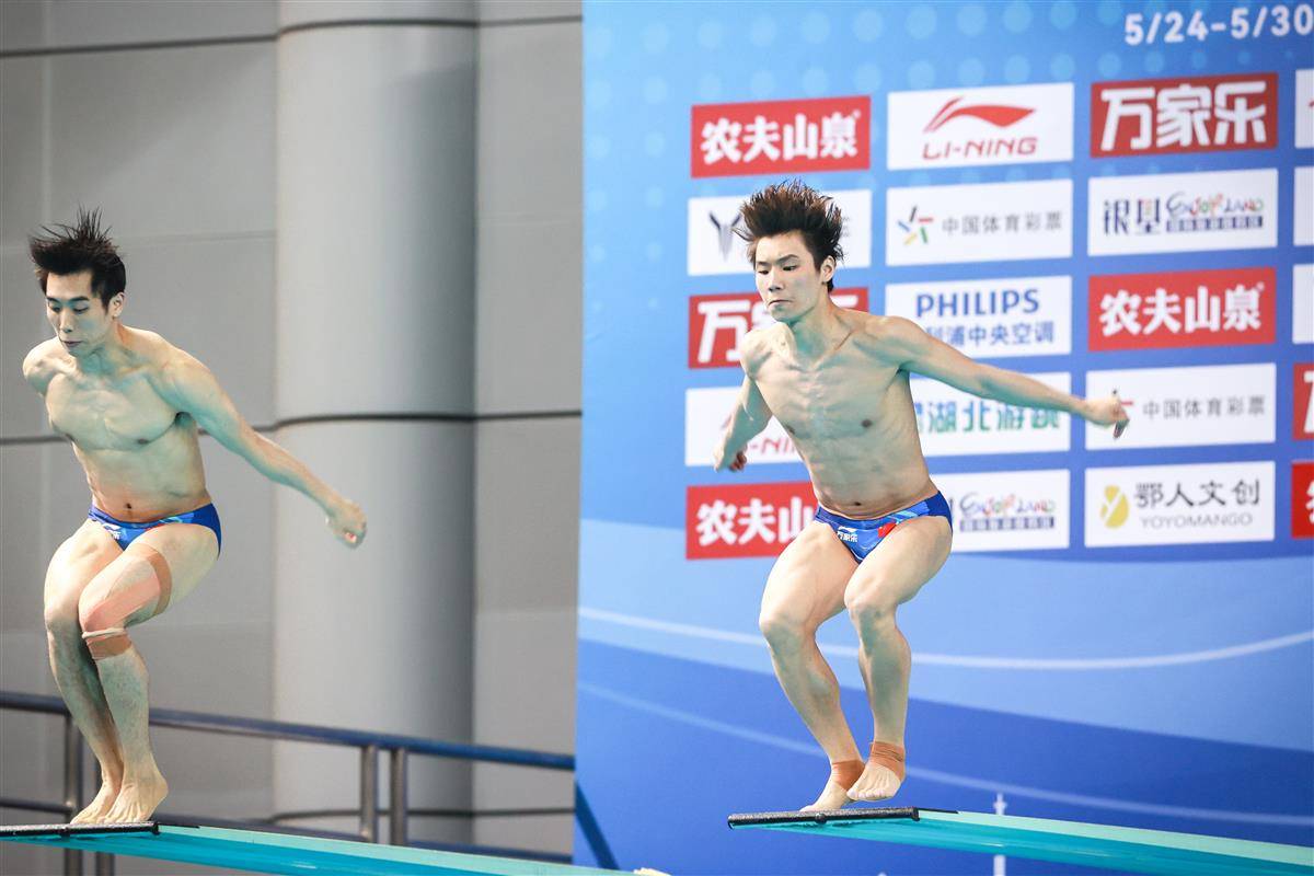 5月27日,武汉体育中心游泳馆,全国游泳冠军赛男子双人三米板决赛,世界冠军、湖北选手郑九源(右)搭档国家队队友、广东队选手胡宇康以437.46分摘银,广东组合谢思埸/黄博文453.12分夺冠。(湖北日报全媒记者 时龚 摄)