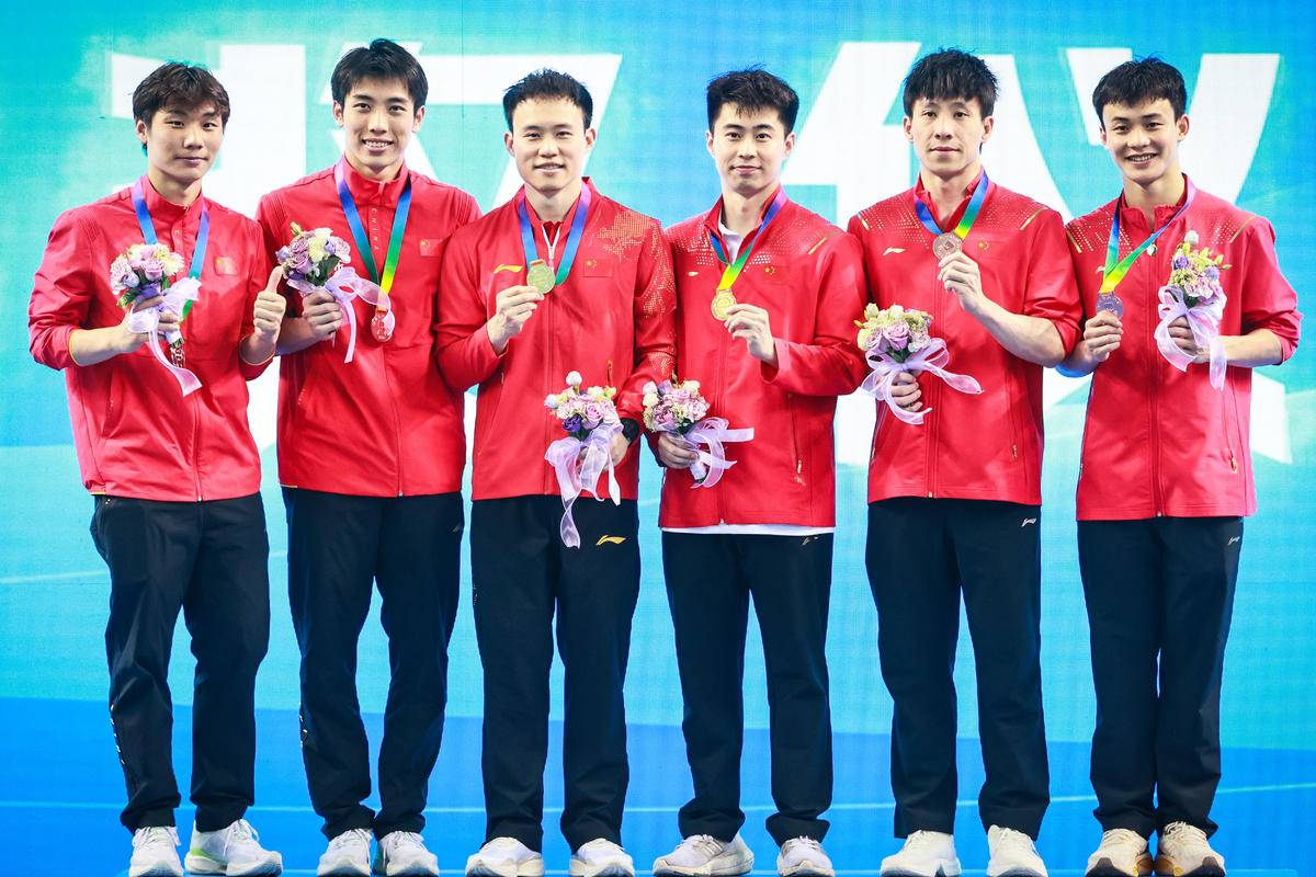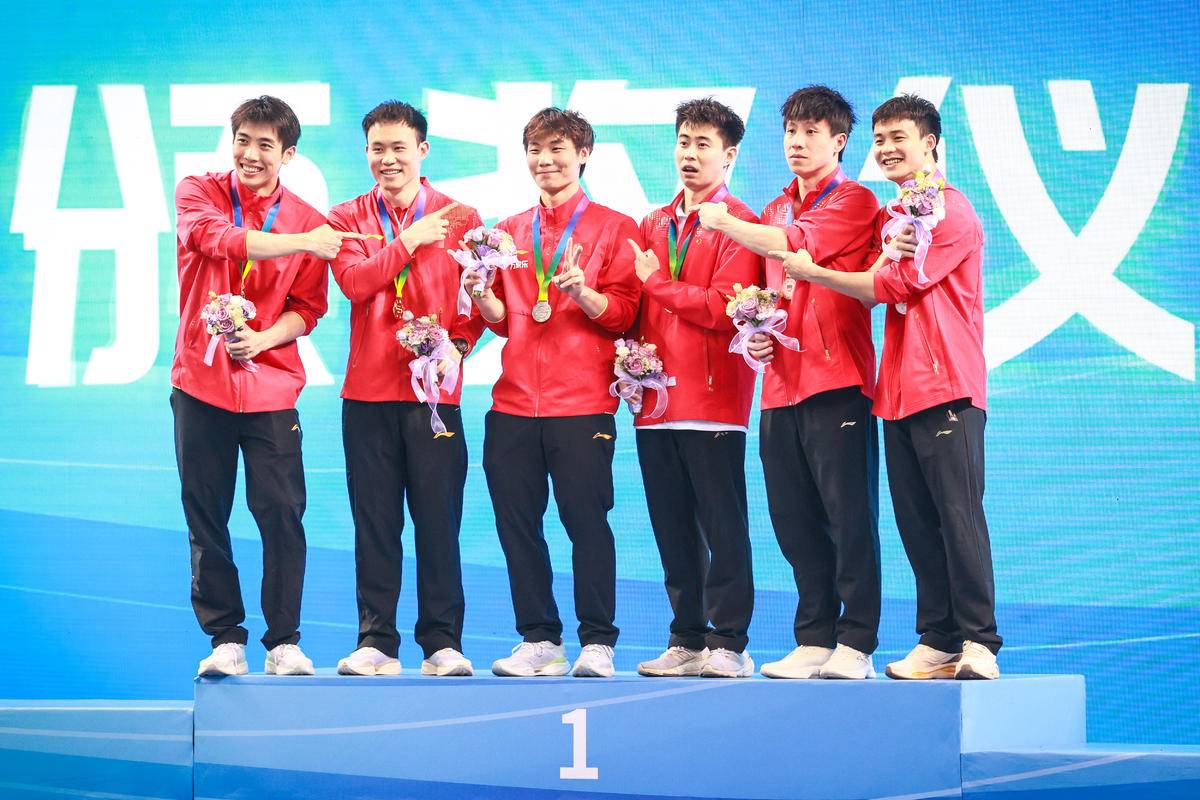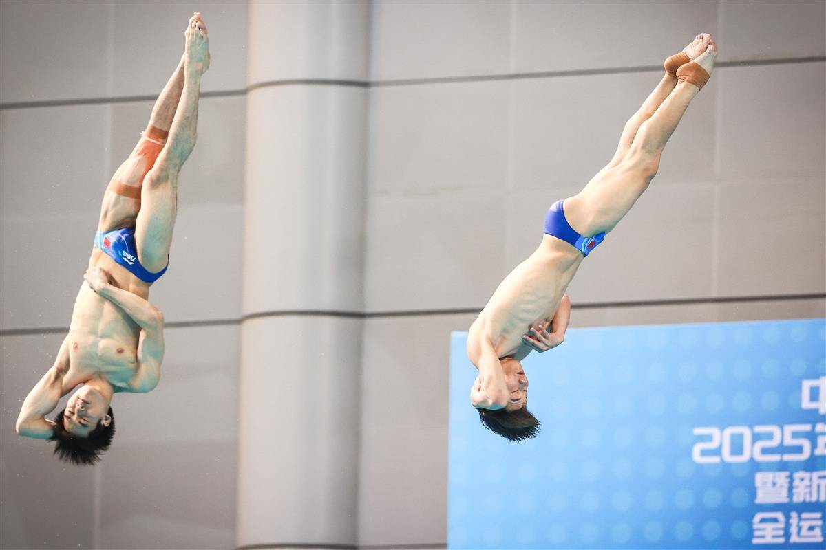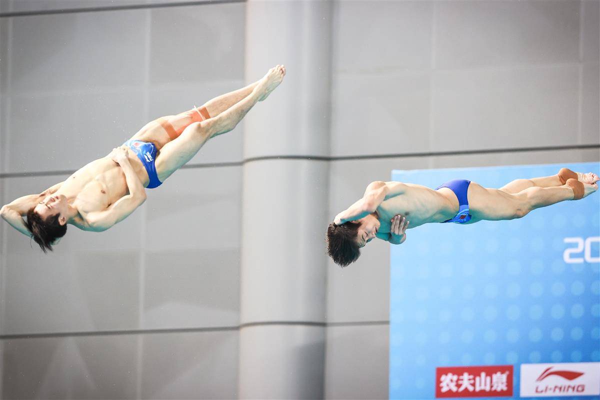 5月27日,武汉体育中心游泳馆,全国游泳冠军赛男子双人三米板决赛,世界冠军、湖北选手郑九源(右)搭档国家队队友、广东队选手胡宇康以437.46分摘银,广东组合谢思埸/黄博文453.12分夺冠。(湖北日报全媒记者 时龚 摄)