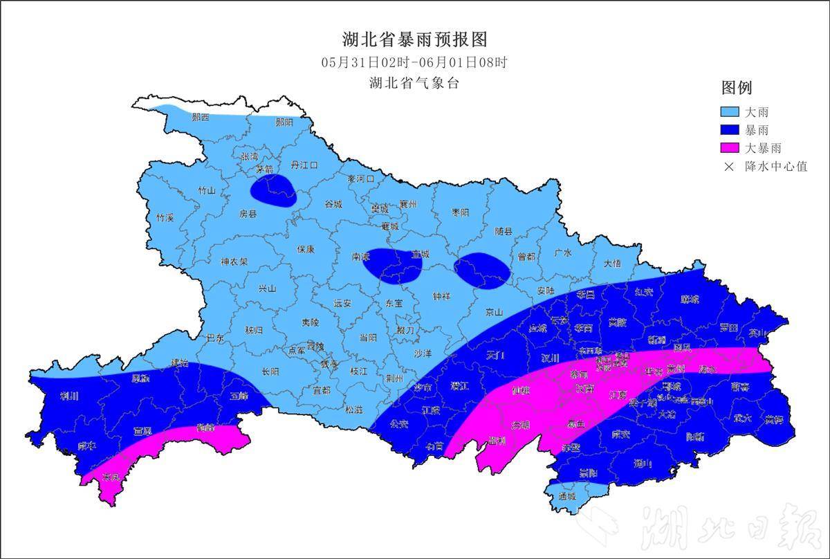 湖北日报讯(记者曾莉)5月30日15时49分,湖北省气象台发布暴雨橙色省级预警称,预计5月31日凌晨至6月1日早晨,鄂西南、江汉平原及以东地区有暴雨,其中恩施南部、荆州东部、仙桃、武汉、鄂州、黄冈、咸宁等局地大暴雨,并伴有短时强降水和局地雷暴大风;6月1日白天东部地区仍有大雨到暴雨,1日晚上至2日凌晨降雨逐步减弱结束。请注意防范。