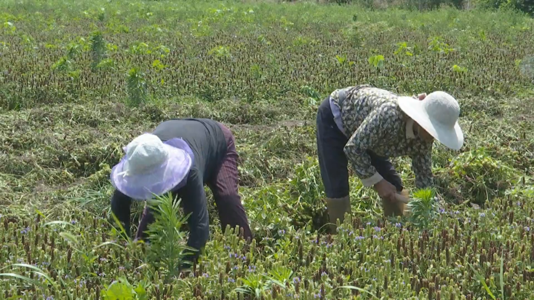走进秦市乡秦家场村,田间药香四溢,一片片夏枯草穗头饱满,镰起刀落间,村民们忙着收割“黄金草”。