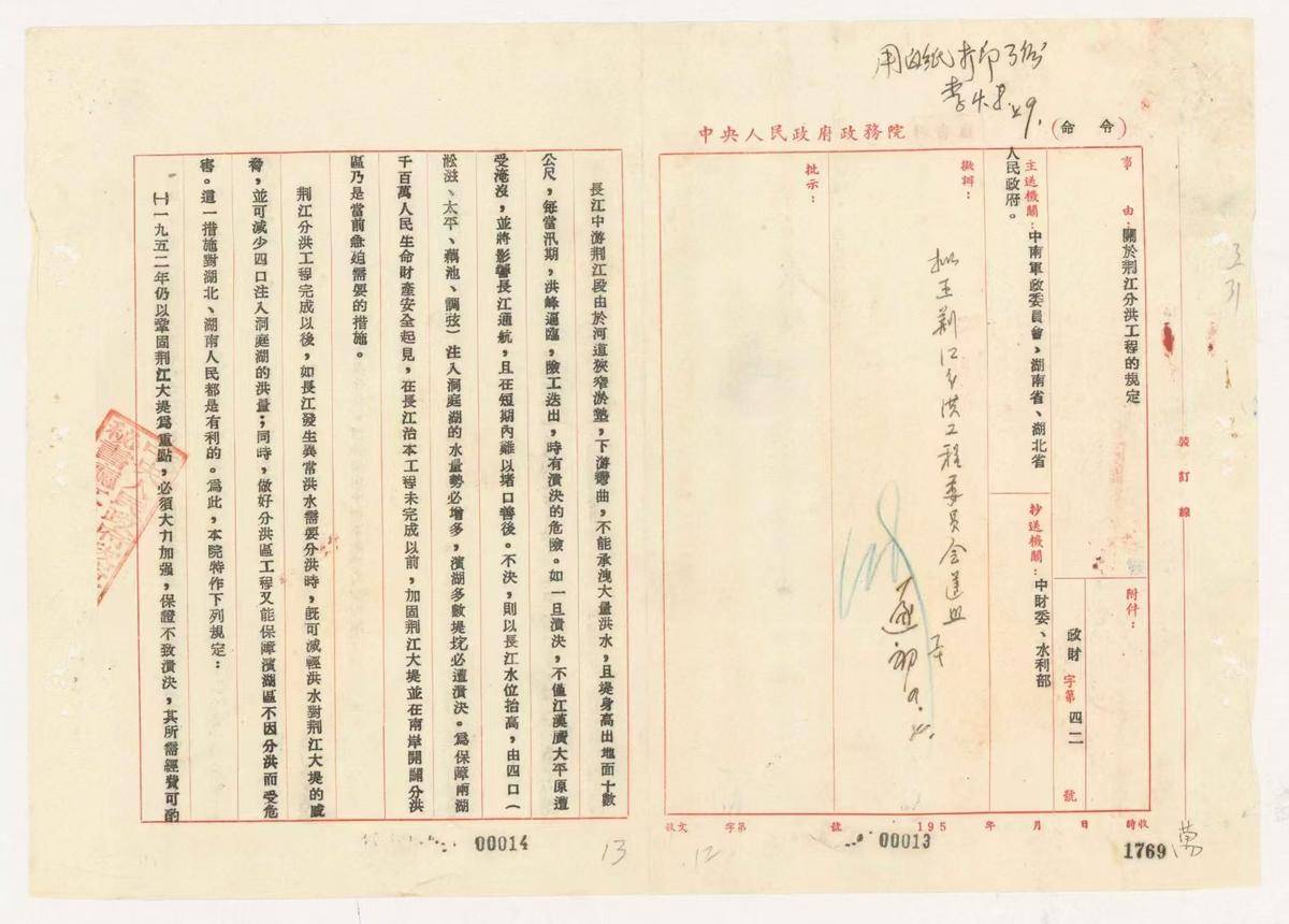 1952年3月31日,中央人民政府政务院关于荆江分洪工程的规定(省档案馆馆藏)