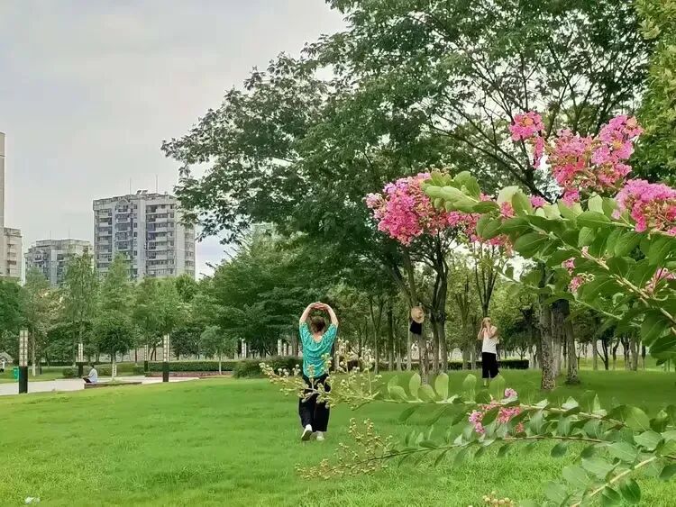 沿着公园中心走了一圈,绿树在头顶织成凉棚,红花在脚边铺开画卷,晨练的人、觅食的鸟、盛放的花,连同远处江面上粼粼的波光,都融在这闷热却鲜活的晨光里。忽然懂了古人“最爱湖东行不足”的心境——这滨江公园的清晨啊,哪怕日日来寻,也总有新的热闹与温柔,叫人迈不开脚步,只想把这满目的生机,都收进眼底、藏进心里。