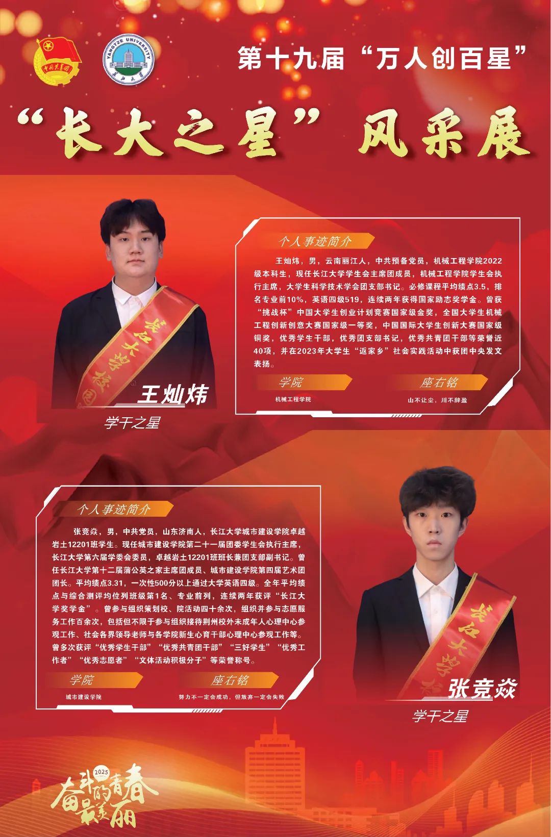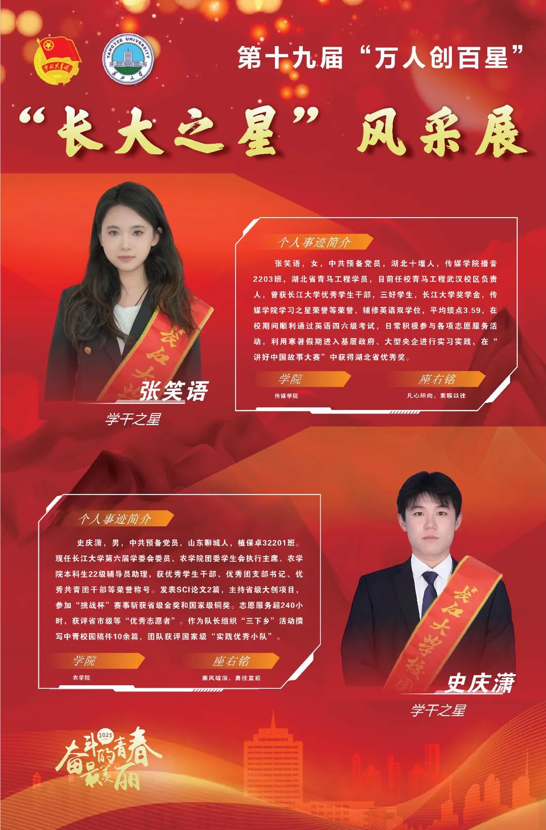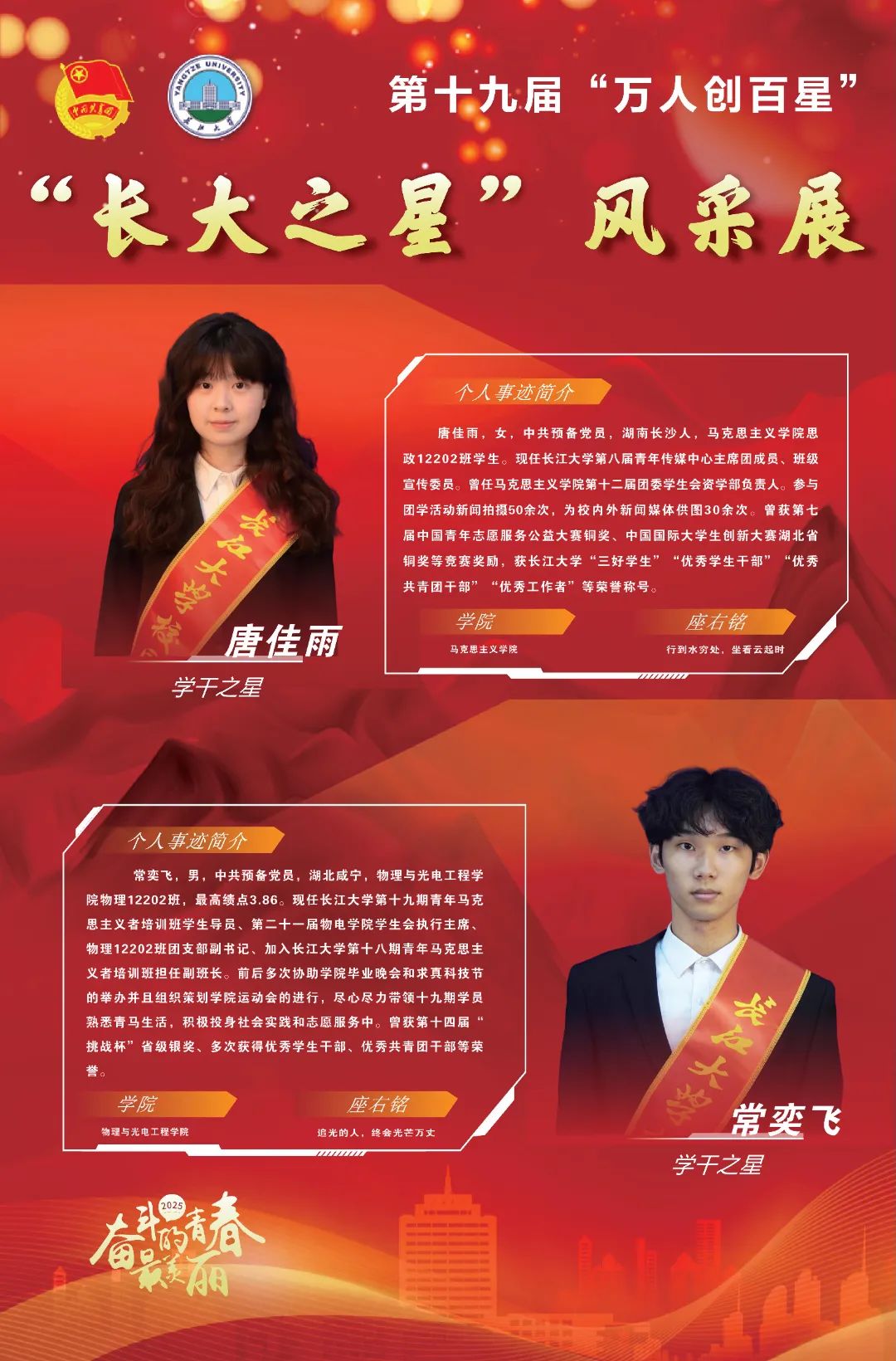 现在,让我们共同见证,第十九届(2025)“万人创百星”“学干之星”的风采!