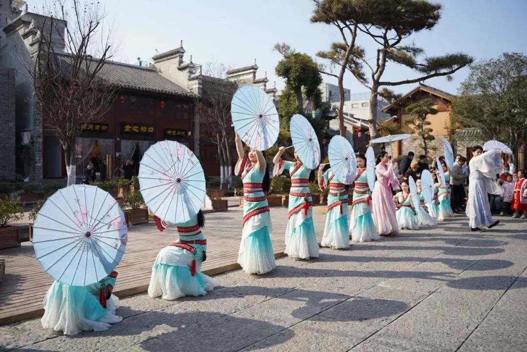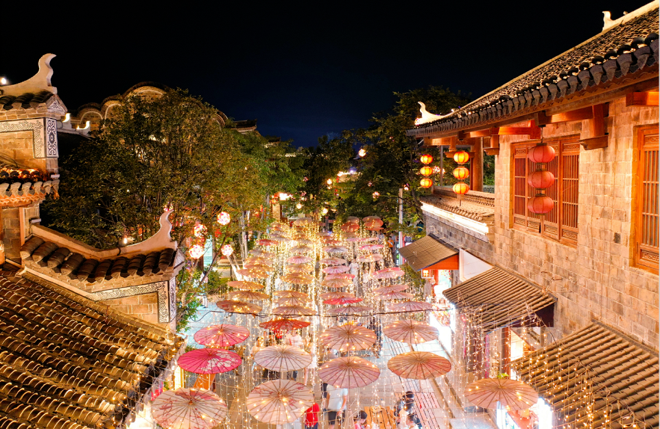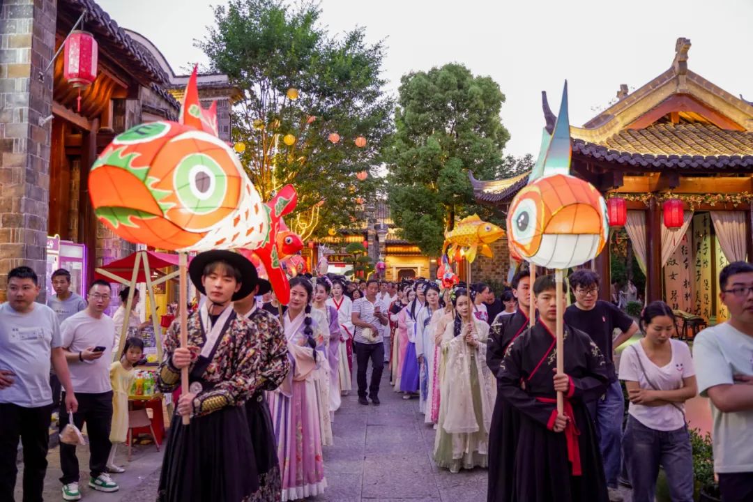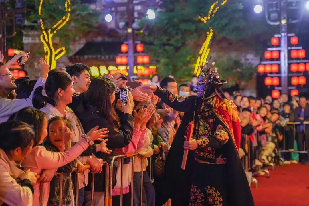 修复后的西关印象以新街与老街为轴线,构建“古今对话”的场景。新街680米聚焦沉浸体验,诗韵九雅、房陵十八馆等主题空间,串联起非遗工坊、3D投影秀、VR活字印刷等互动项目;老街1000米则以传统文化风貌为基底,药王馆、雷天明烈士纪念馆等建筑群,与沿街百戏楼的皮影戏、火龙舞等民俗表演,共同织就一幅动态的“荆楚文化图卷”。