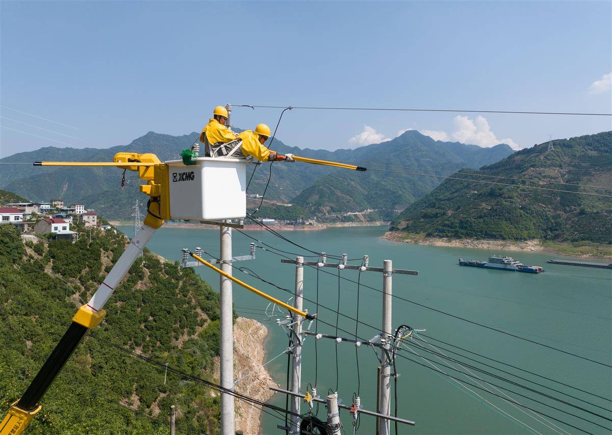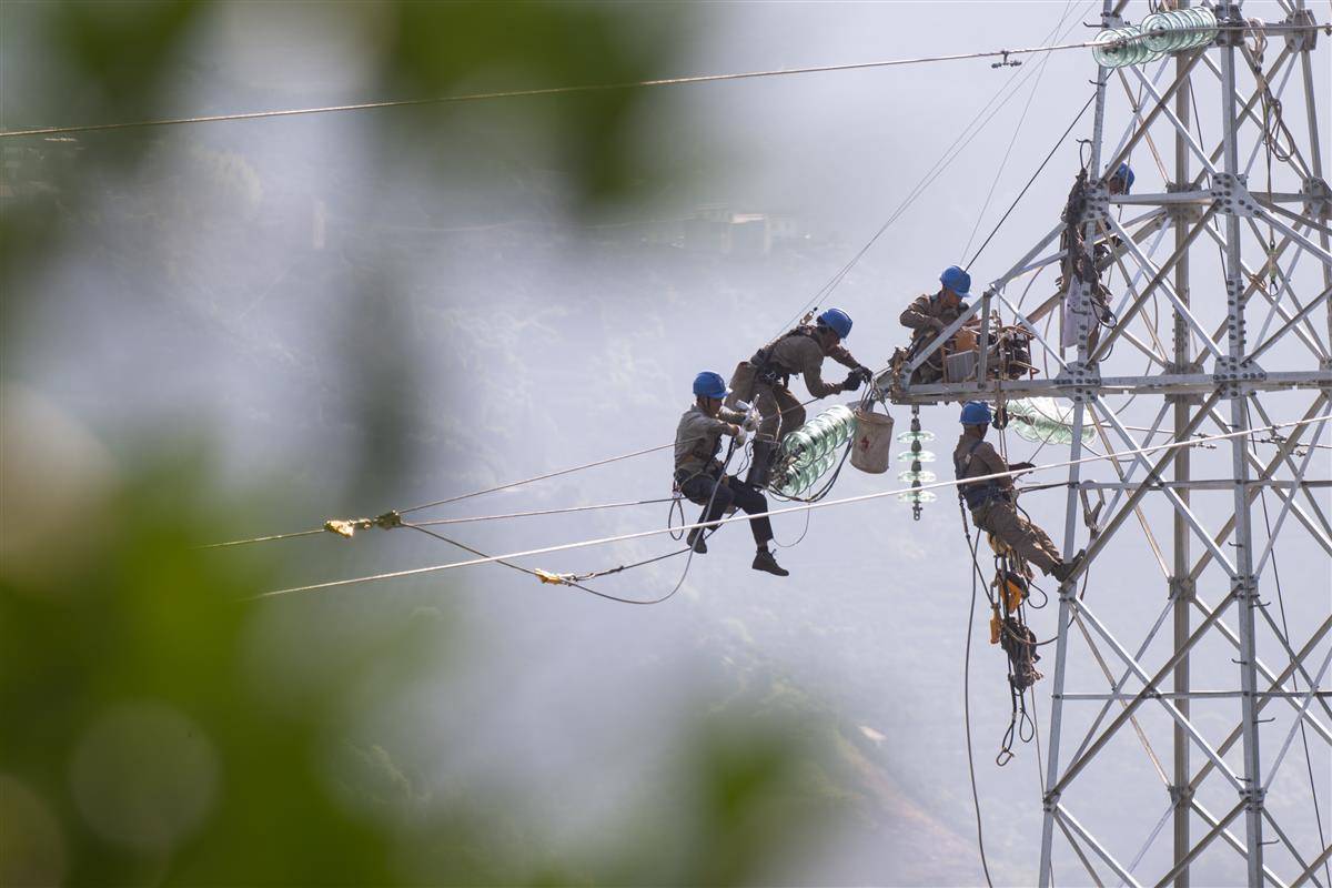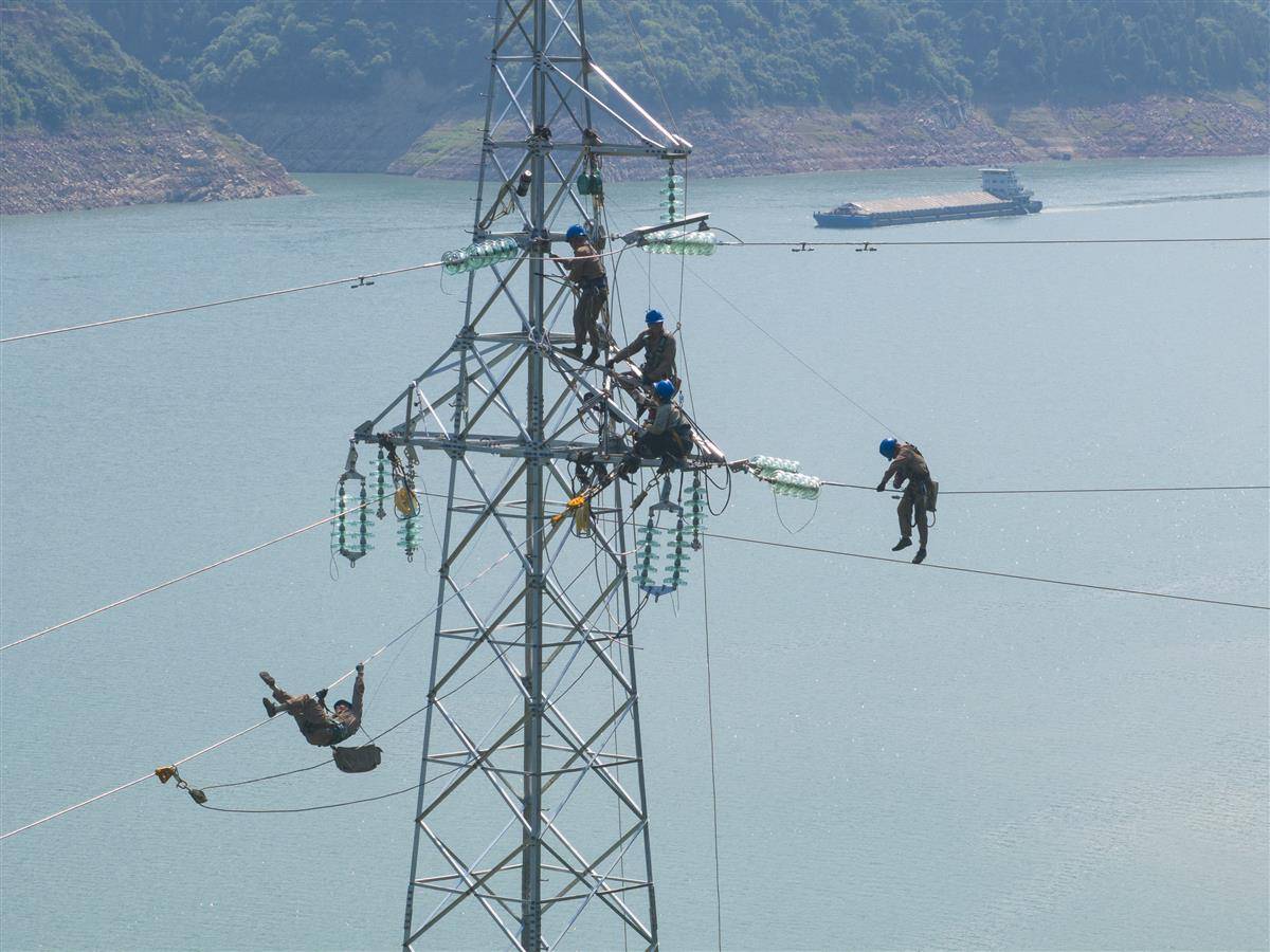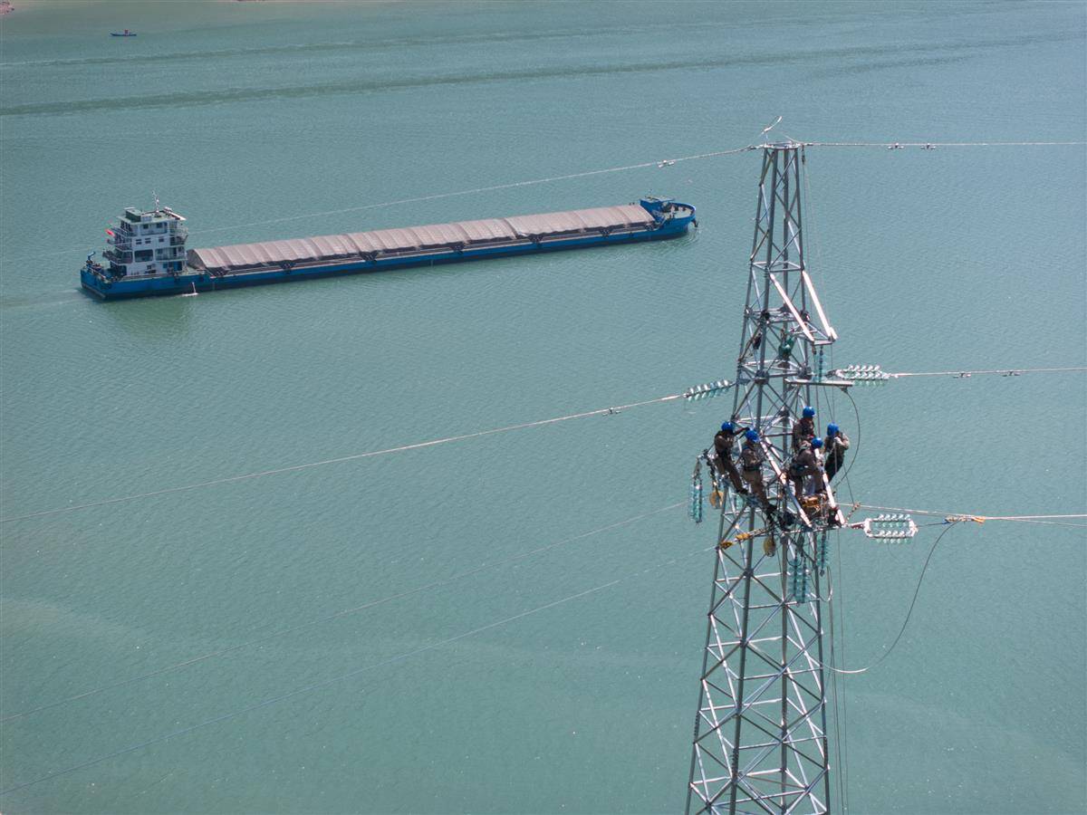 6月12日,供电员工在宜昌市秭归县泄滩乡陈家湾村长江边铁塔上作业。近日,国家电网湖北省宜昌市秭归县供电公司组织专班对房五高速公路建设中的35千伏泄归线输电线路进行迁改,确保房五高速公路项目建设顺利进行。房五高速是“鄂湘三江三山”(长江、清江、汉江、武当山、神农架、武陵山)世界旅游走廊的关键通道和《国家公路网规划》11条北南纵线的联络线之一,建设里程全长251公里。(视界网 雷勇 韩英 摄)