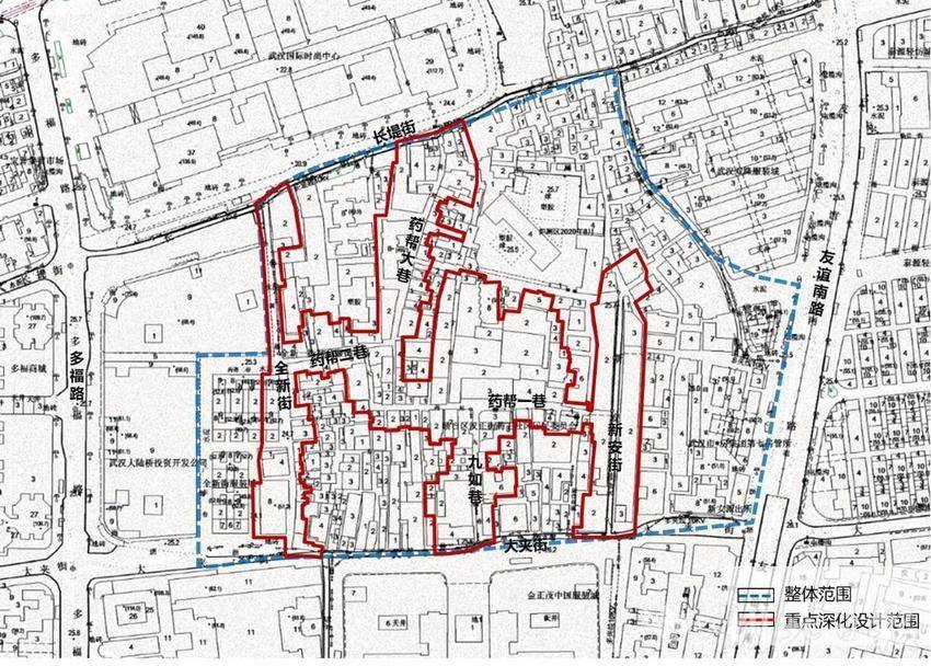 本次征集包括整体范围、重点深化设计范围。整体范围为汉正街新安九如片区,北至长堤街,南至大夹街,东至友谊南路,西至全新街,用地面积约10.8公顷。重点深化设计范围为新安九如片区“两街三巷”,即新安街、全新街、药帮一巷、药帮大巷、九如巷,以及大夹街、长堤街周边,全长约1千米,用地面积约4.08公顷。