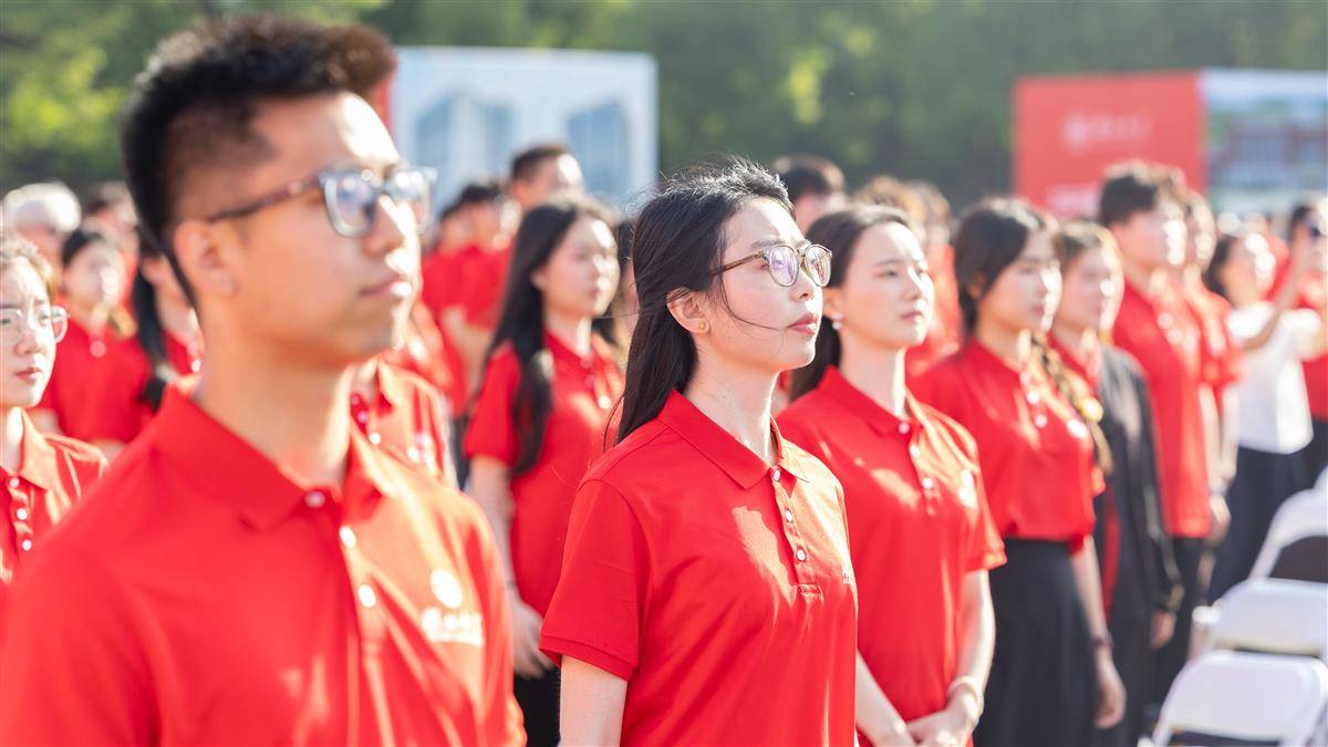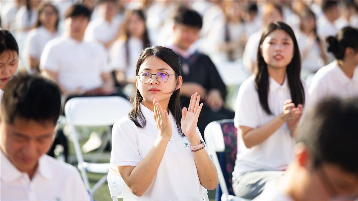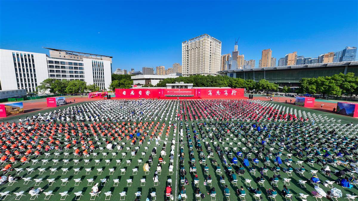 2025年6月16日,湖北大学2025年毕业典礼暨学位授予仪式在湖北大学二号体育场举行,全校师生合唱五月天《知足》,让青春的歌声回荡在校园的每个角落。(湖北日报全媒记者 何宇欣 摄)