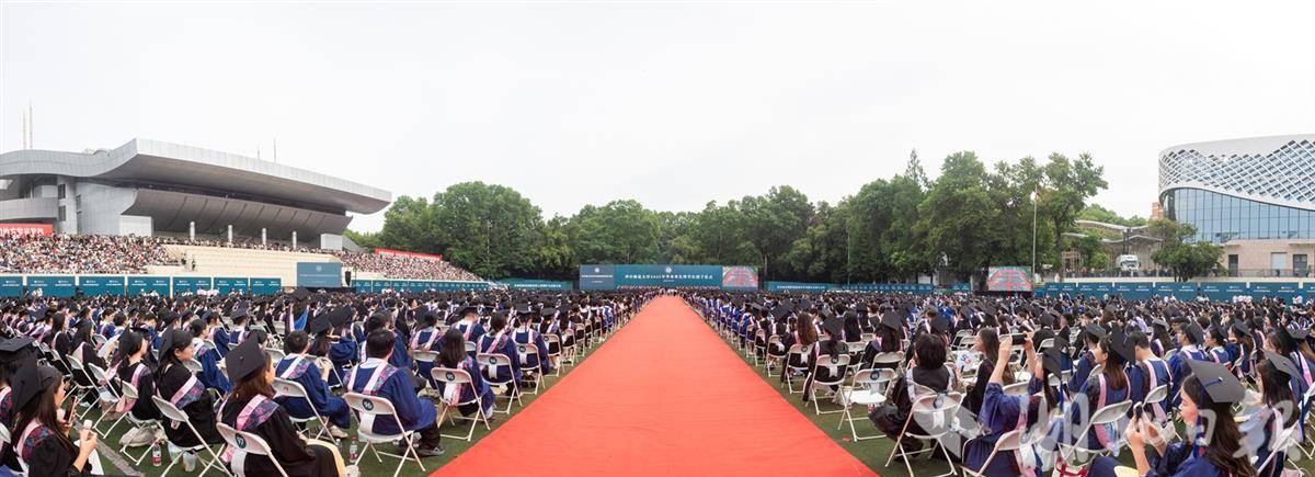 “南湖浪涌,桂香灵动”,熟悉的校歌旋律回荡在佑铭体育场。来自各学院的80位导师分列体育场两侧,为毕业生一一拨穗,并颁发学位证书。