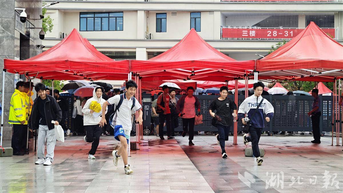 考生跑出考场,笑容在雨中绽放。