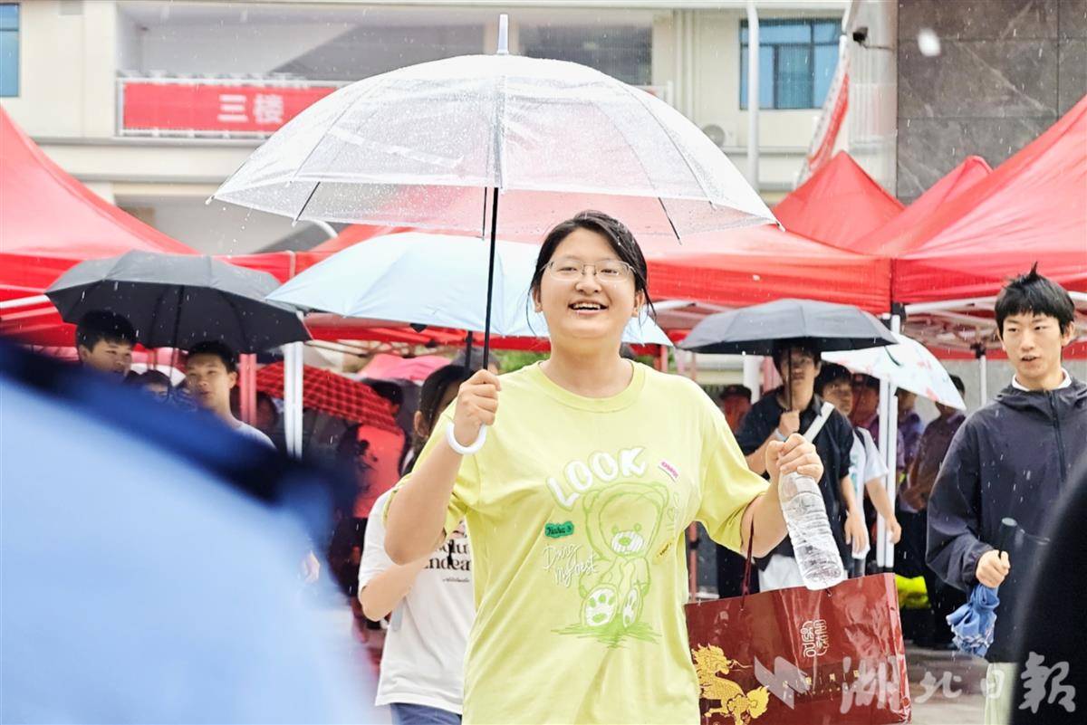 考生自信走出考场,笑容在雨中绽放。