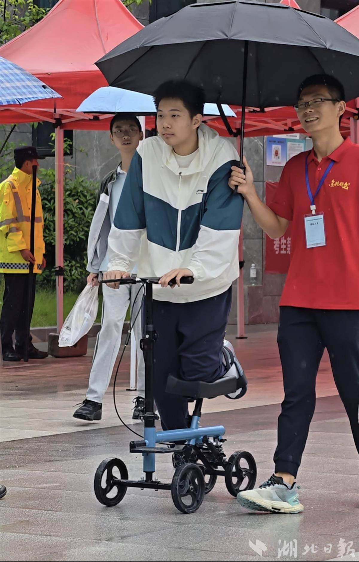工作人员为一位行动不便的考生撑伞,将其送出考场。
