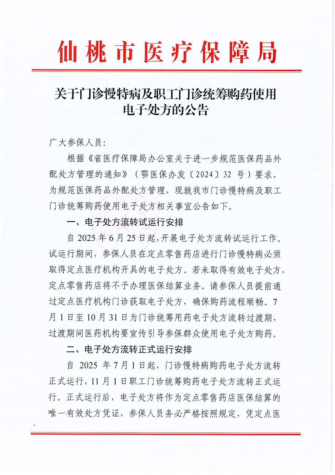 根据《省医疗保障局办公室关于进一步规范医保药品外配处方管理的通知》(鄂医保办发〔2024〕32号)要求,为规范医保药品外配处方管理,现就我市门诊慢特病及职工门诊统筹购药使用电子处方相关事宜公告如下。