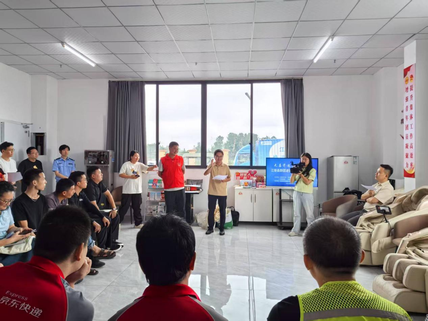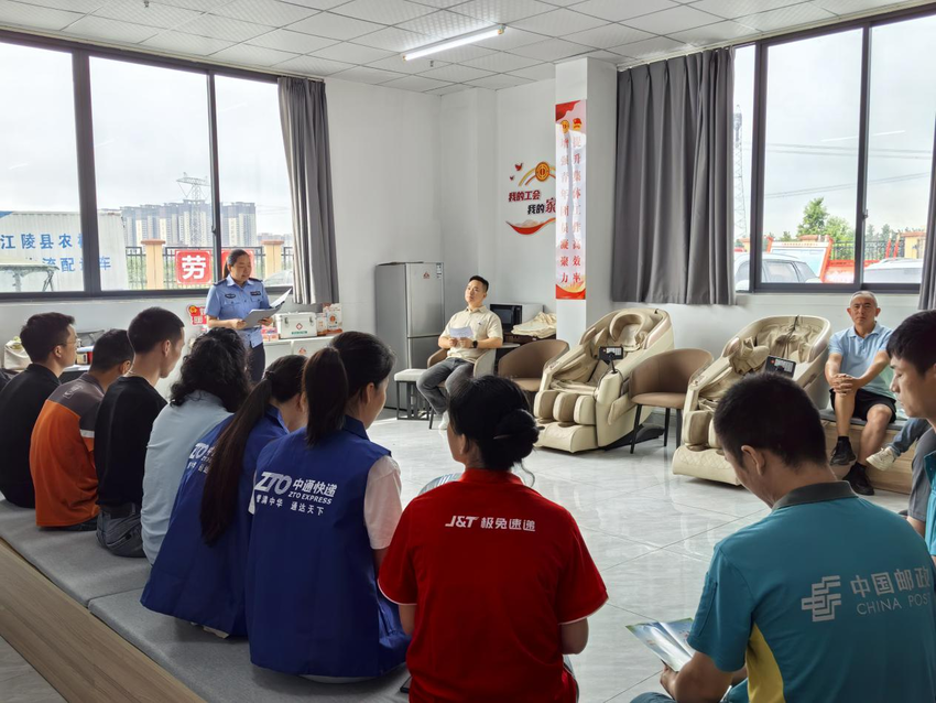为织密寄递行业安全防护网,凝聚群团普法合力,6月26日,第38个国际禁毒日,江陵县总工会联合团县委、县妇联、县科协、县残联、县禁毒大队等部门走进快递行业工会联合会工会驿站开展“无毒寄递,平安出行”普法宣传活动,为快递从业人员上了一节“禁毒+安全”普法课堂。